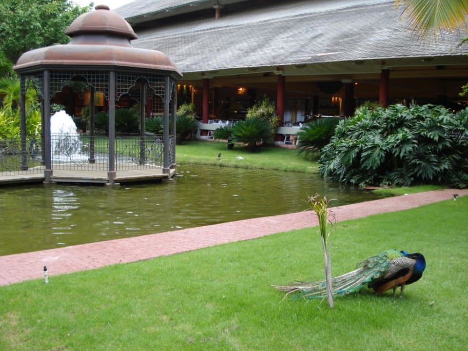 Gartenanlage und dahinter Restaurant
