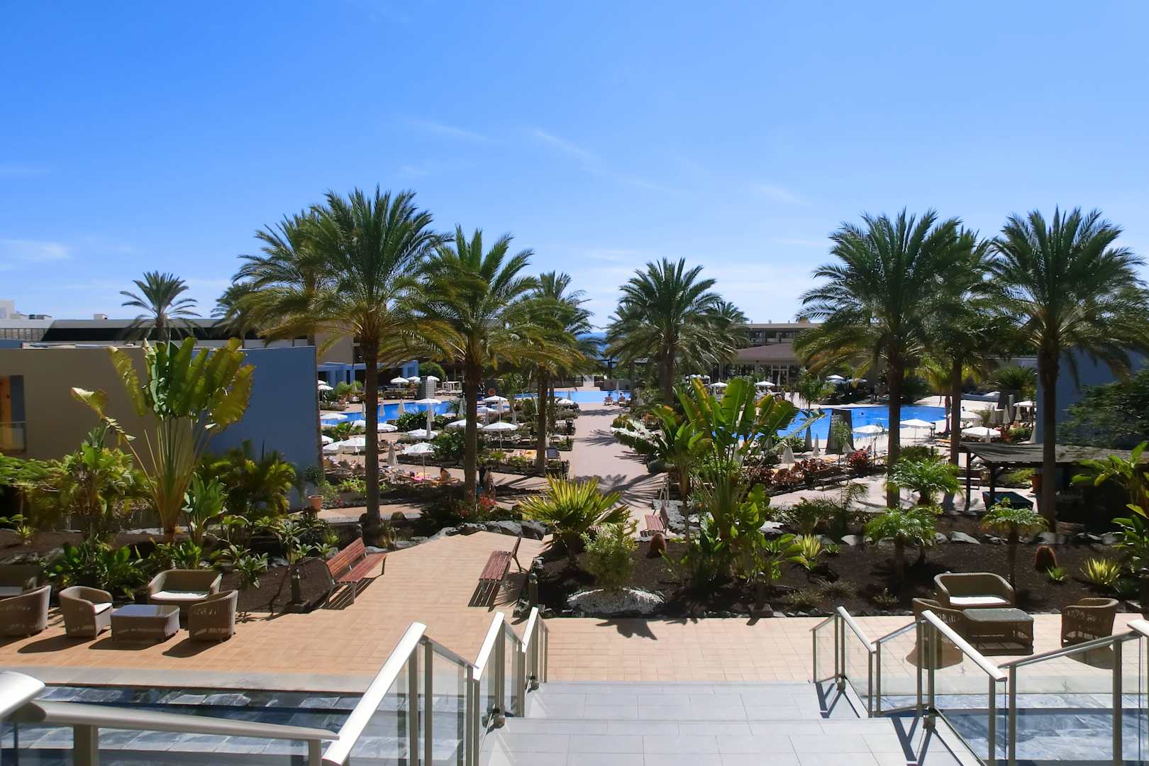 Garten und Poolanlage v. Restaurant aus gesehen