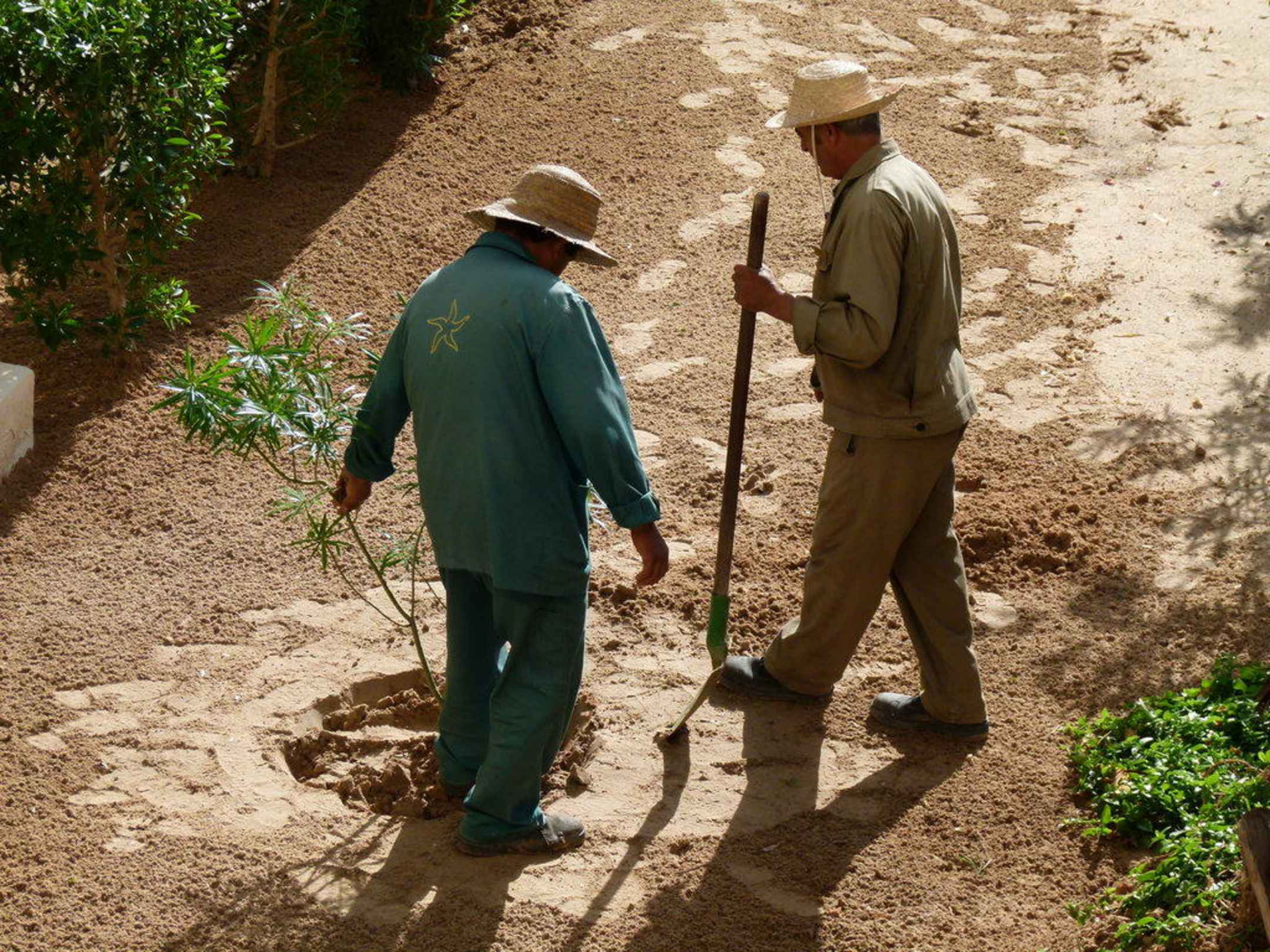 Gärtner beim Pfanzen einer Blumepflanze [Oleander]