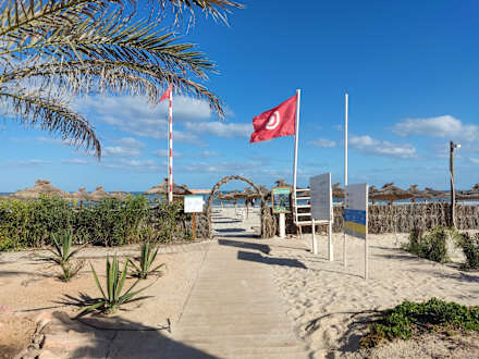 Zugang zum Strand, an der Flagge sieht man, ob man im Meer schwimmen kann oder nicht