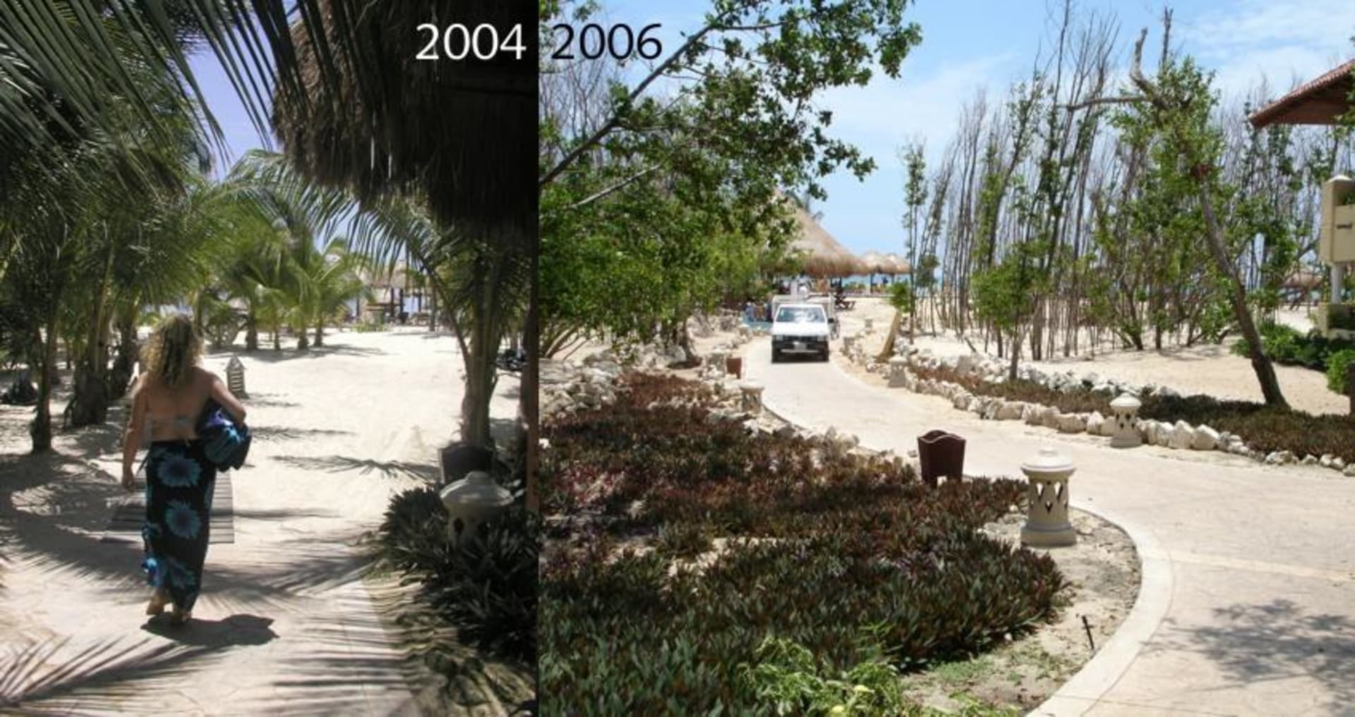 Vergleich Strand Paraiso Beach 2004-2006Hier sehen Sie den direkte Vergleich vom Zwischenraum zwischen Hotel und Strand vor und nach Hurrikan Wilma. Fast der kompltte Grundbestand wurde zerstört, die sonnenschützenden Palmen sind leider nur noch in Fetzen vorhanden.