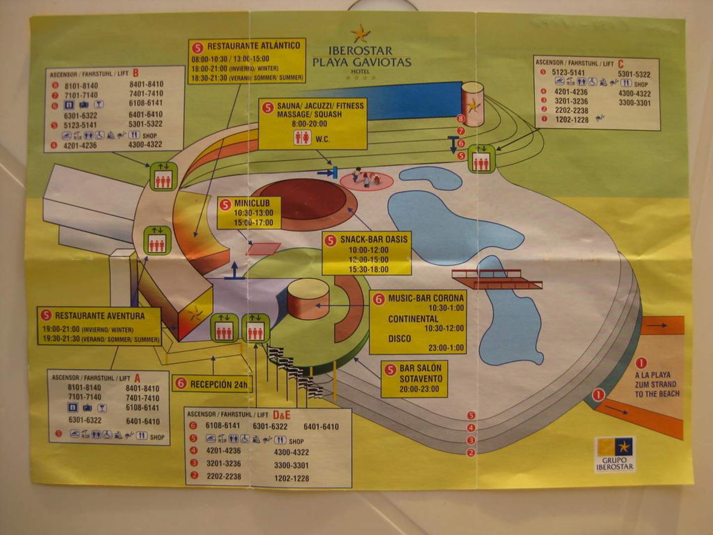 Lage des Hotels: oben = Nord Die weißen Stockwerkangaben auf rotem Kreis (2-8) bedeuten in diesem Fall genau die Südausrichtung der Zimmer (in Richtung Leuchtturm Jandia)