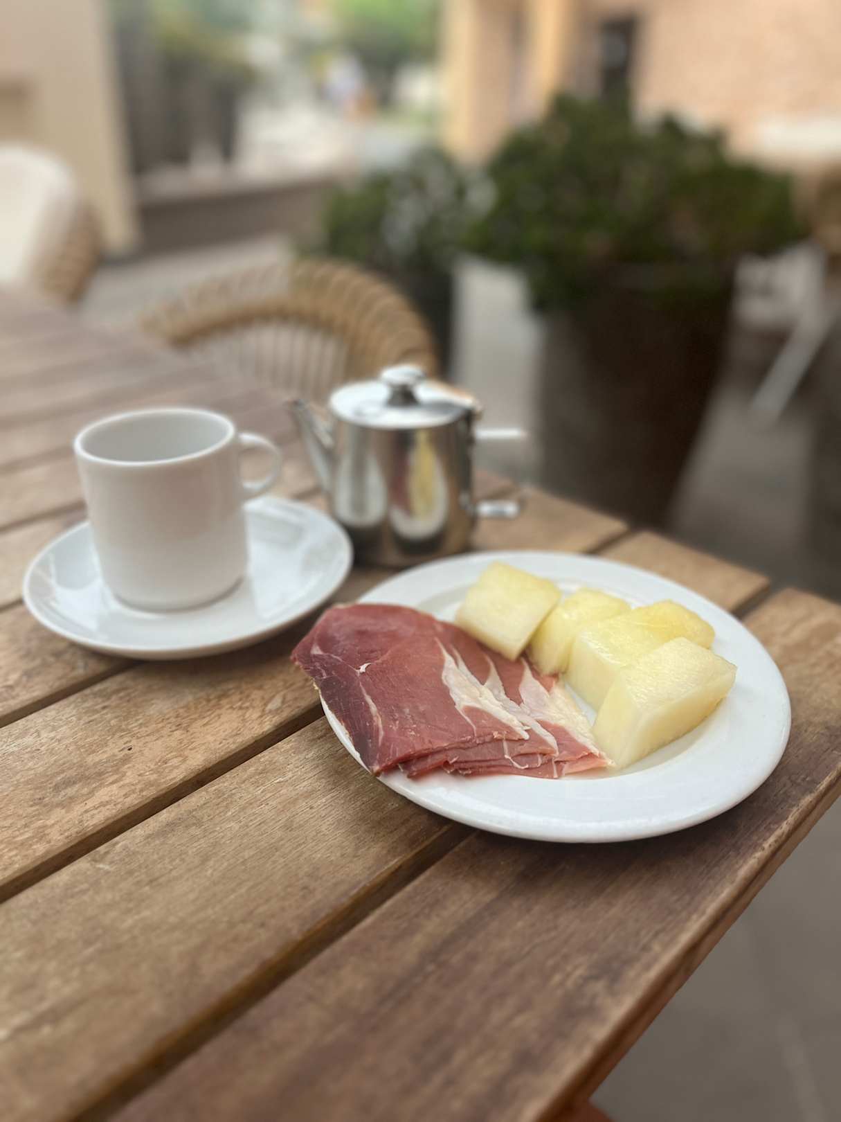 Kaffee und Serranoschinken/Honigmelone