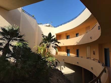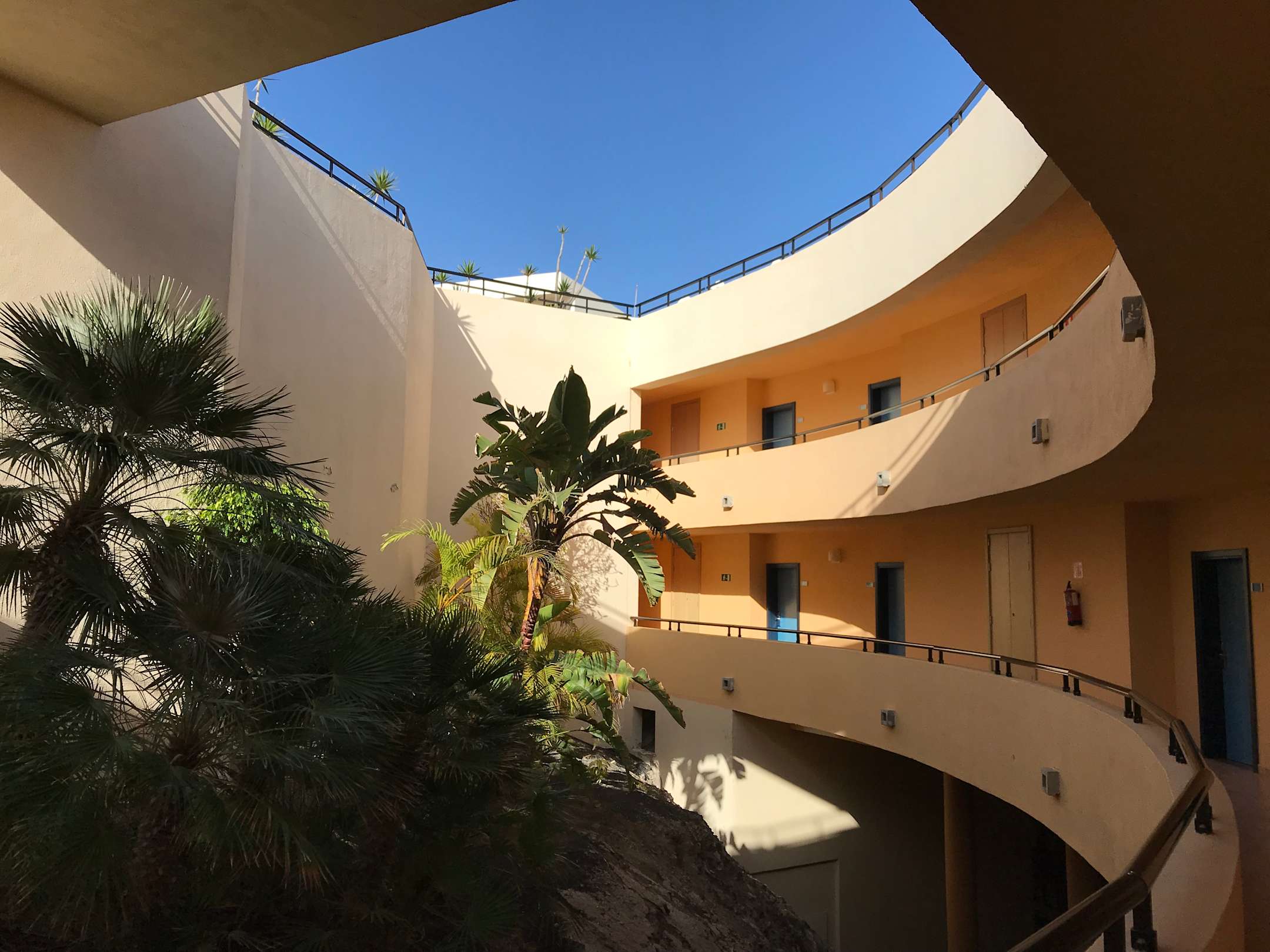 Der Weg zu den Zimmern. Das Gebäude ist offen gestaltet.
