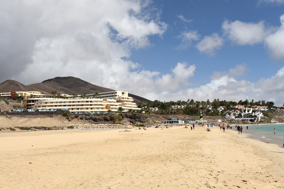 Blick vom Strand auf das Hotel (links)