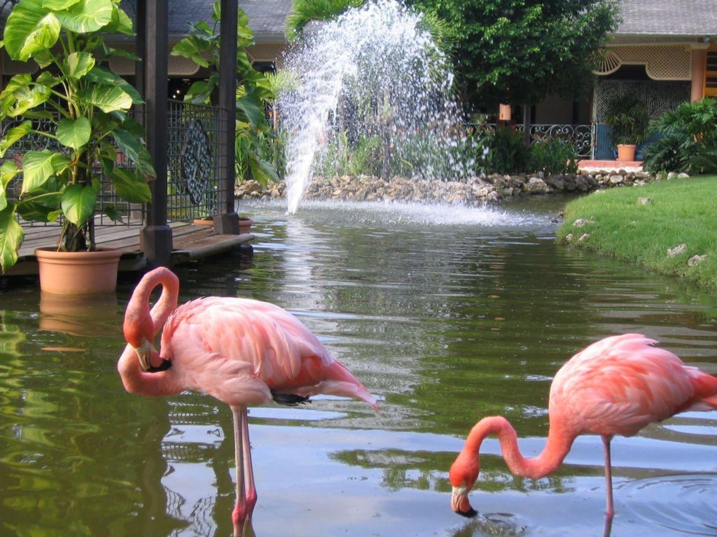FlamingosTeich vor dem Hauptrestaurant mit Flamingos..