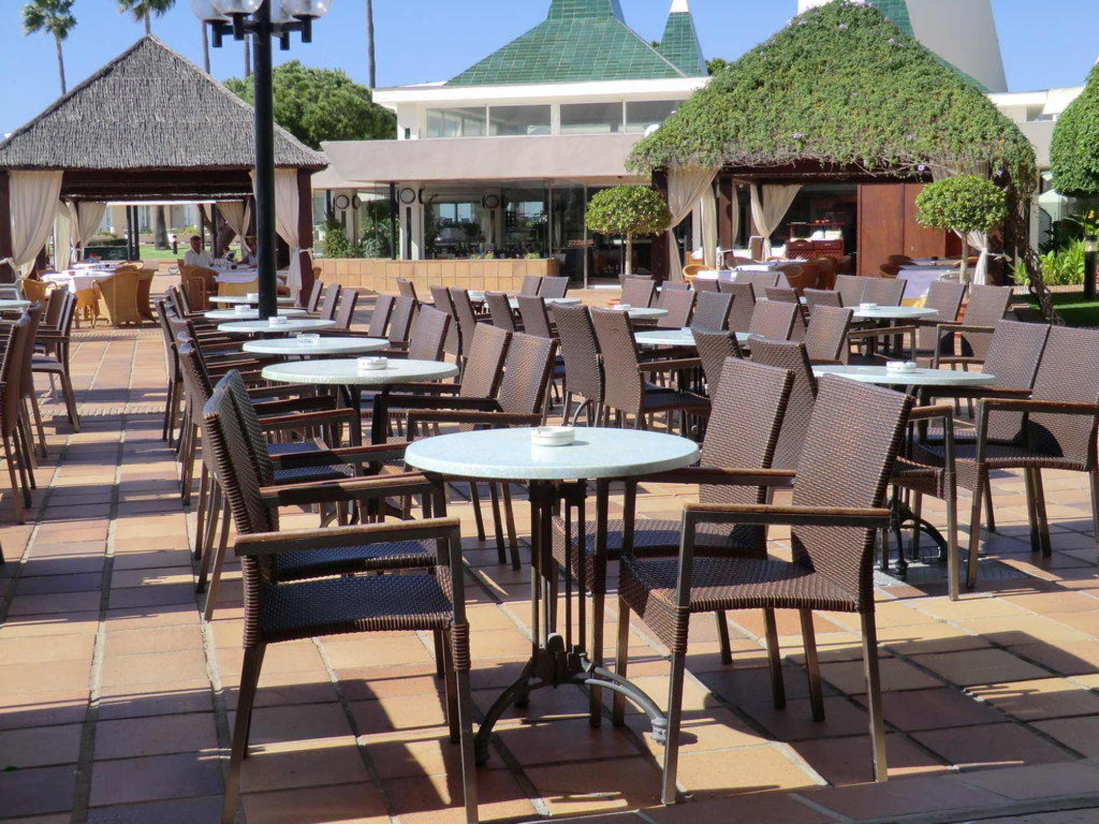 Bestuhlung vor der Baran der Bar sitzend mit Blick auf den Aussenbereich des Restaurants