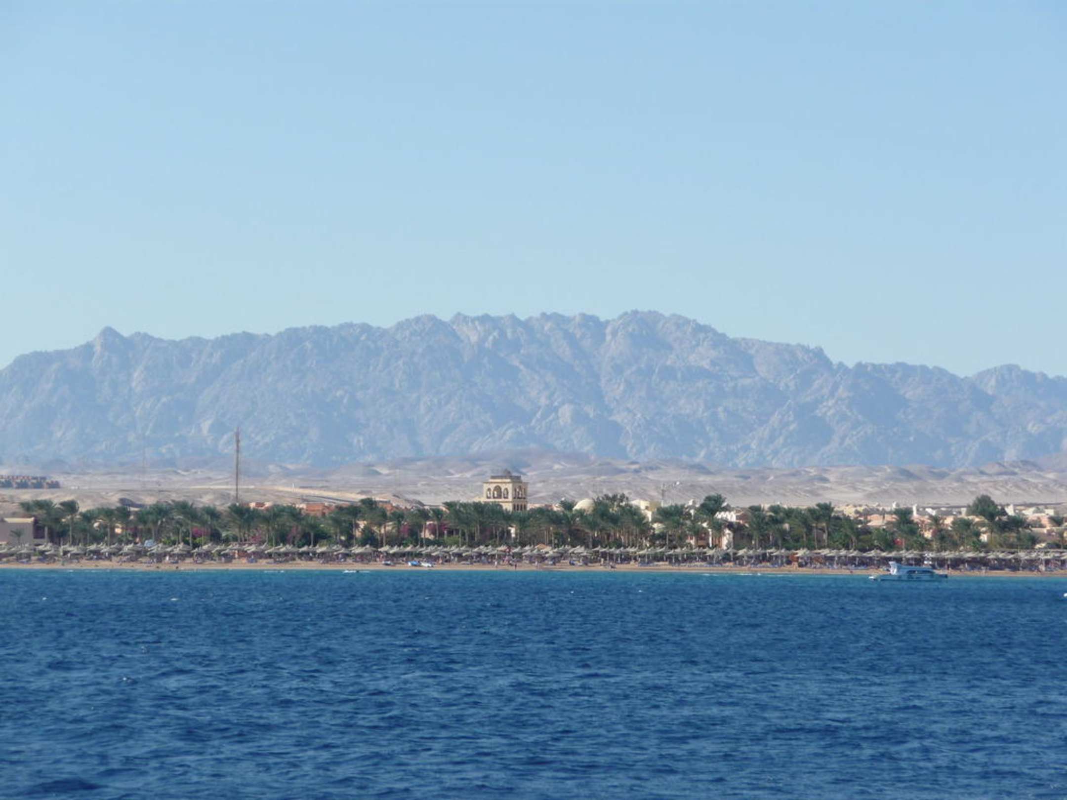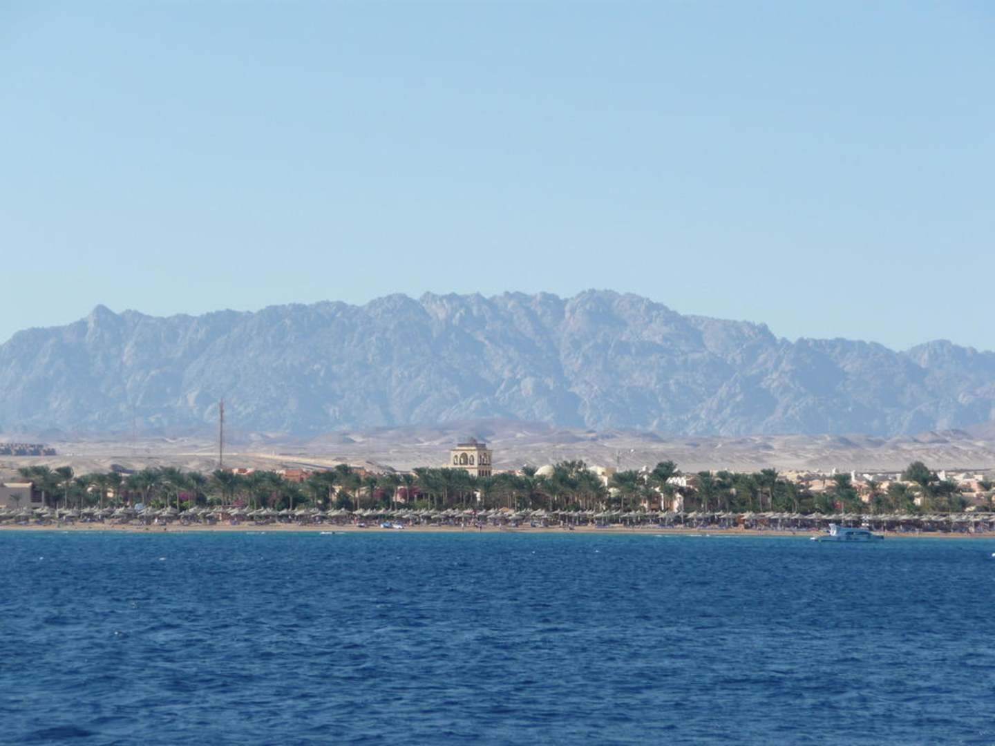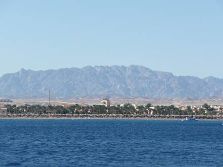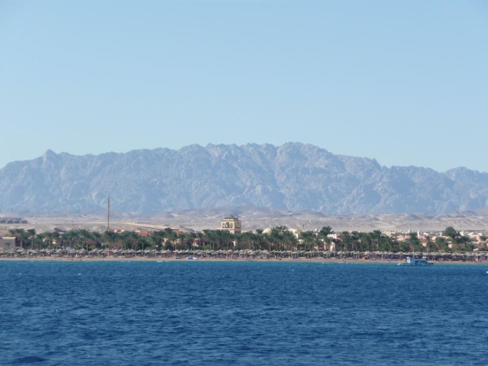 Blick auf den Hotelstrand vom Meer ausSchönster Hotel- und Strandabschnitt in der Makadi-Bucht, das zeigt sich auch vom Boot aus. Man sieht nur den Hotel-Turm, die restliche Hotelanlage ist hinter den Palmen.