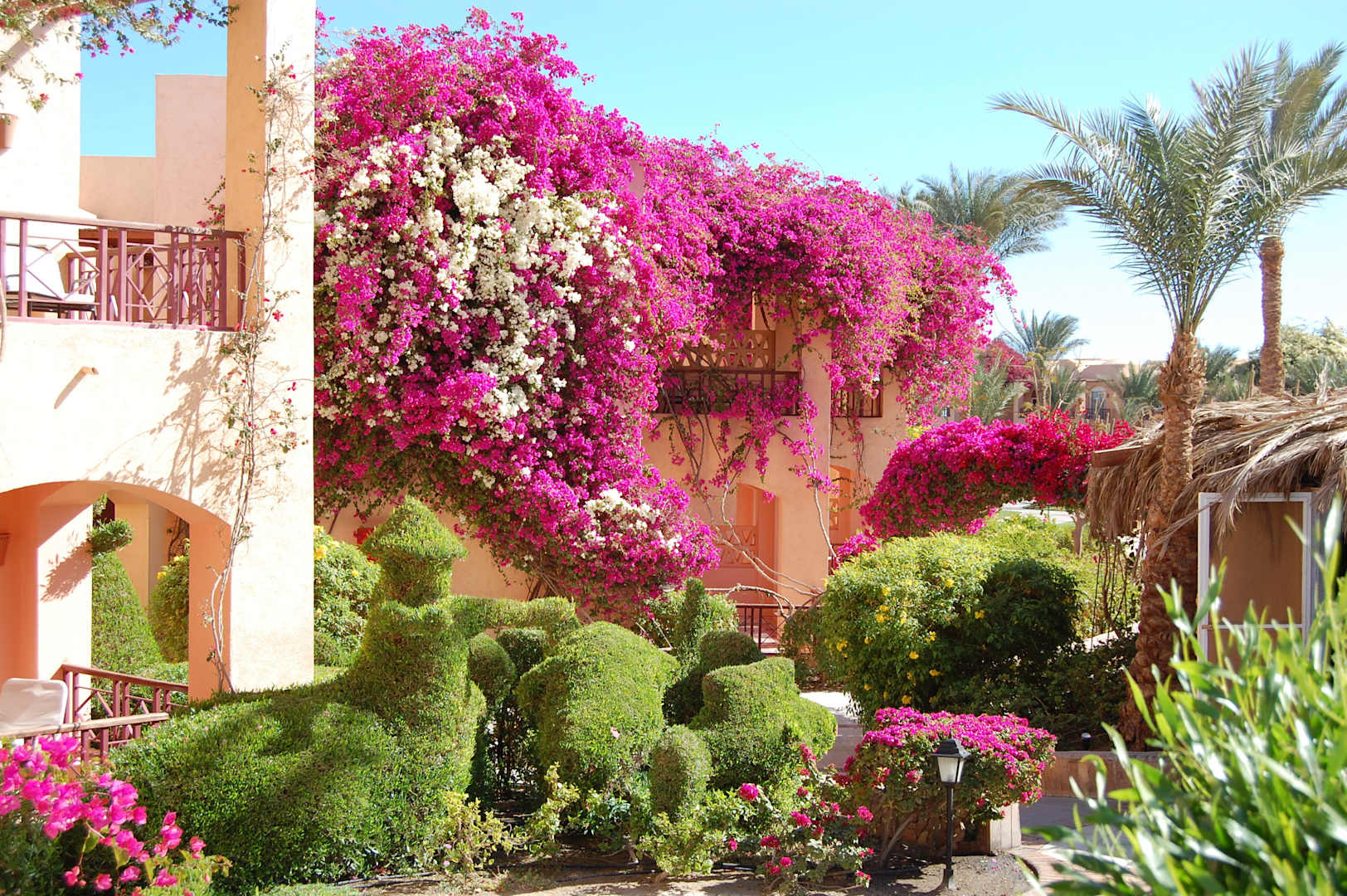 Überall in der Anlage finden sich in Form geschnittene Büsche und leuchtende Blumenstauden.