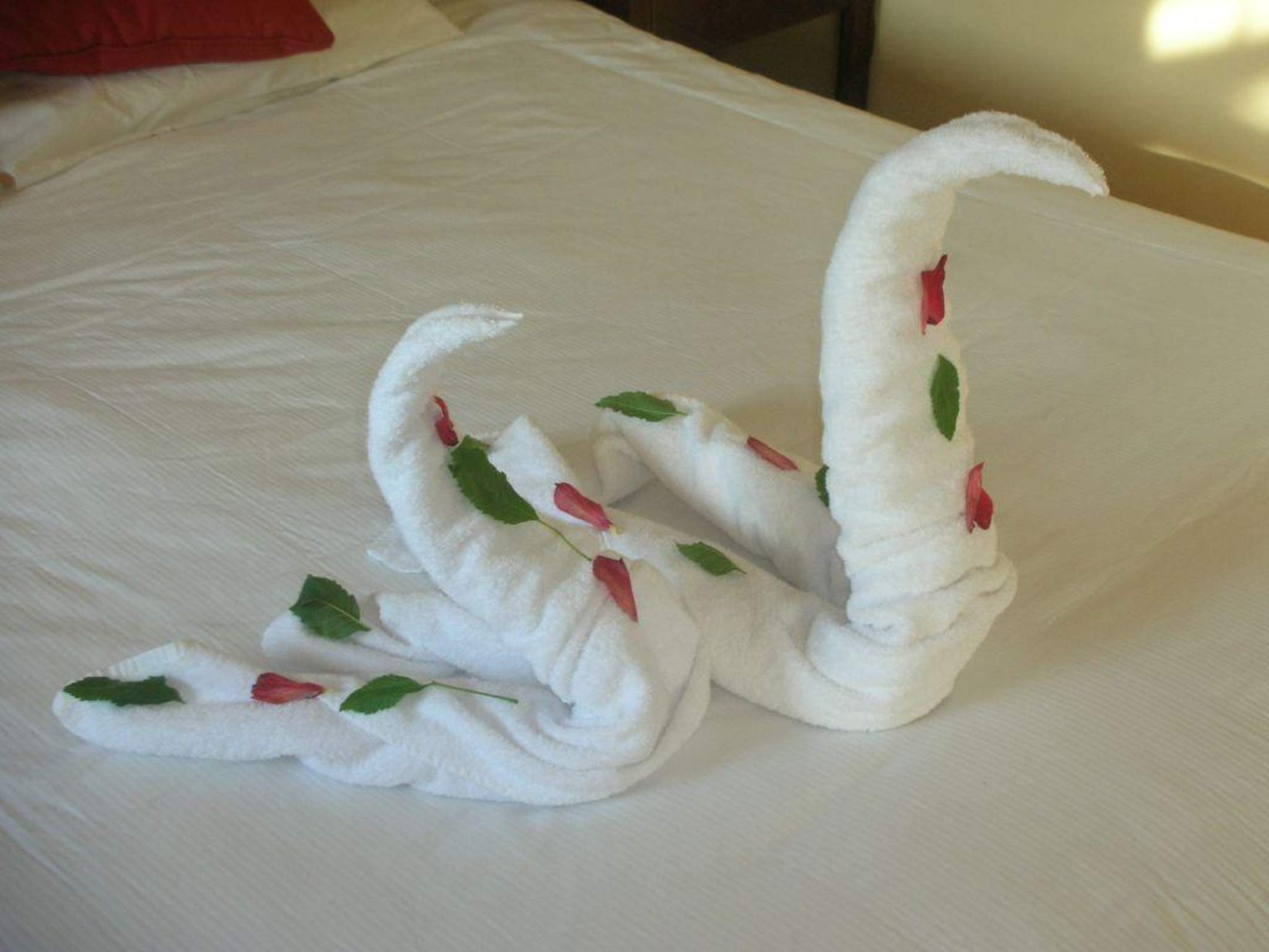 Handtuchfiguren auf dem Bett.
