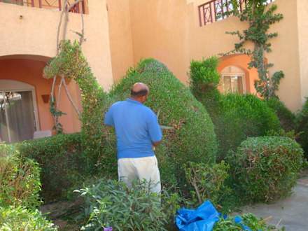 Gärtner schneidet Hecke mit Schere