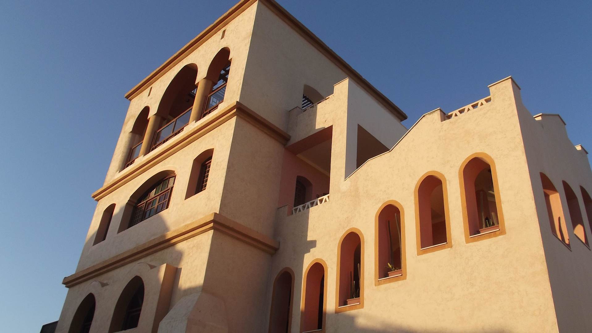 Aussichtsturmdrinnen gibt es Sitzgelegenheit, den Begrüßungsraum und das orientalische Restaurant