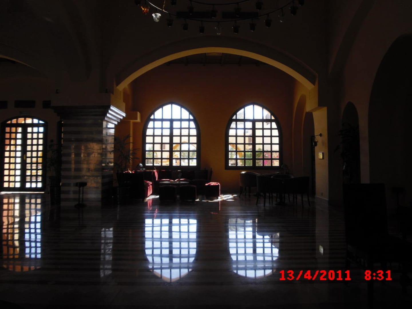 Die Aufnahme zeigt einen kleinen Teil der imposanten Lobby mit wunderschönem Marmorboden und den typisch orientalischen Fenster-formen.