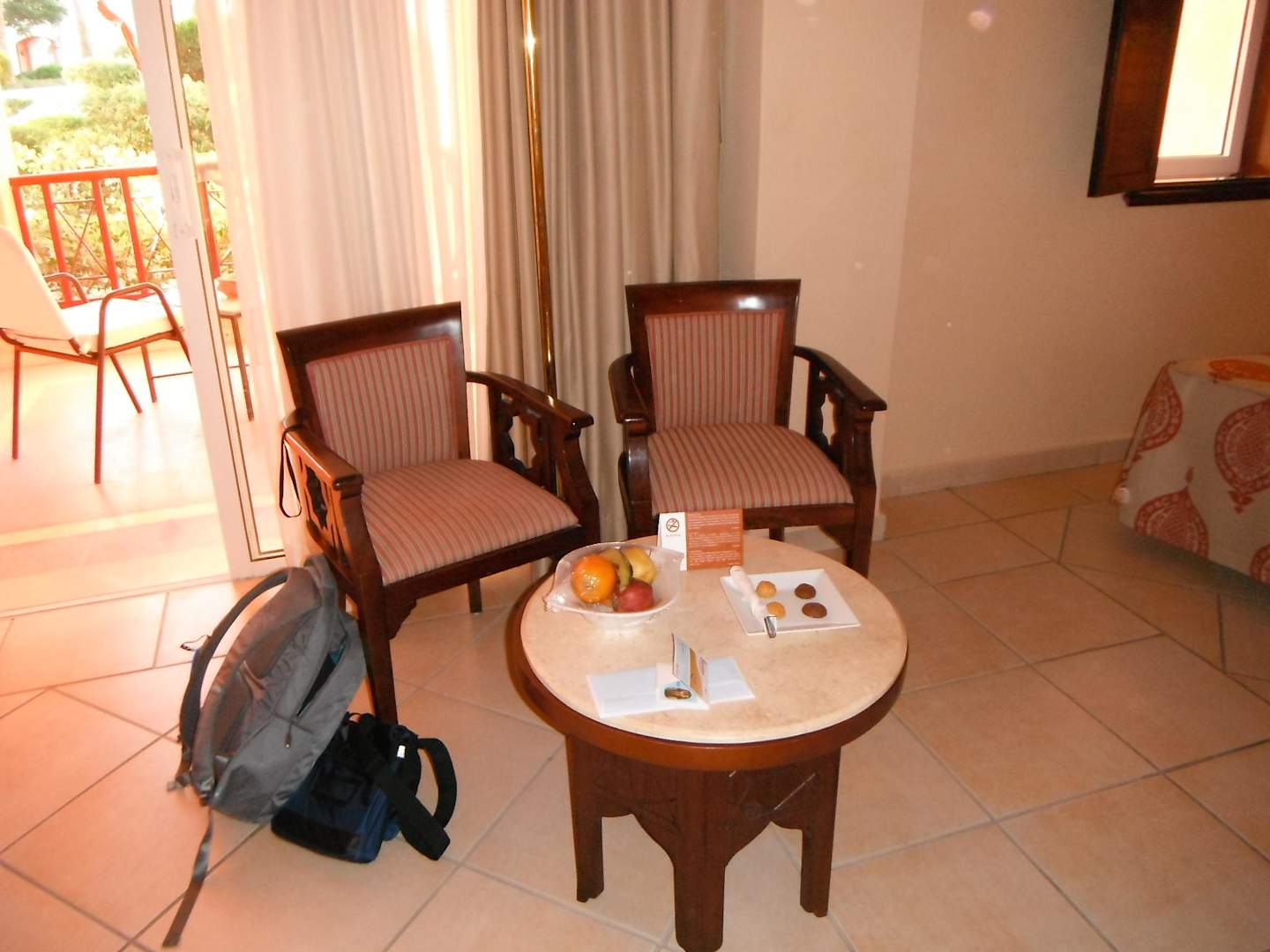 Sitzmöglichkeitmit Obstteller und kleinem Gebäck (Vorsicht: Ameisen werden dadurch schnell angezogen)