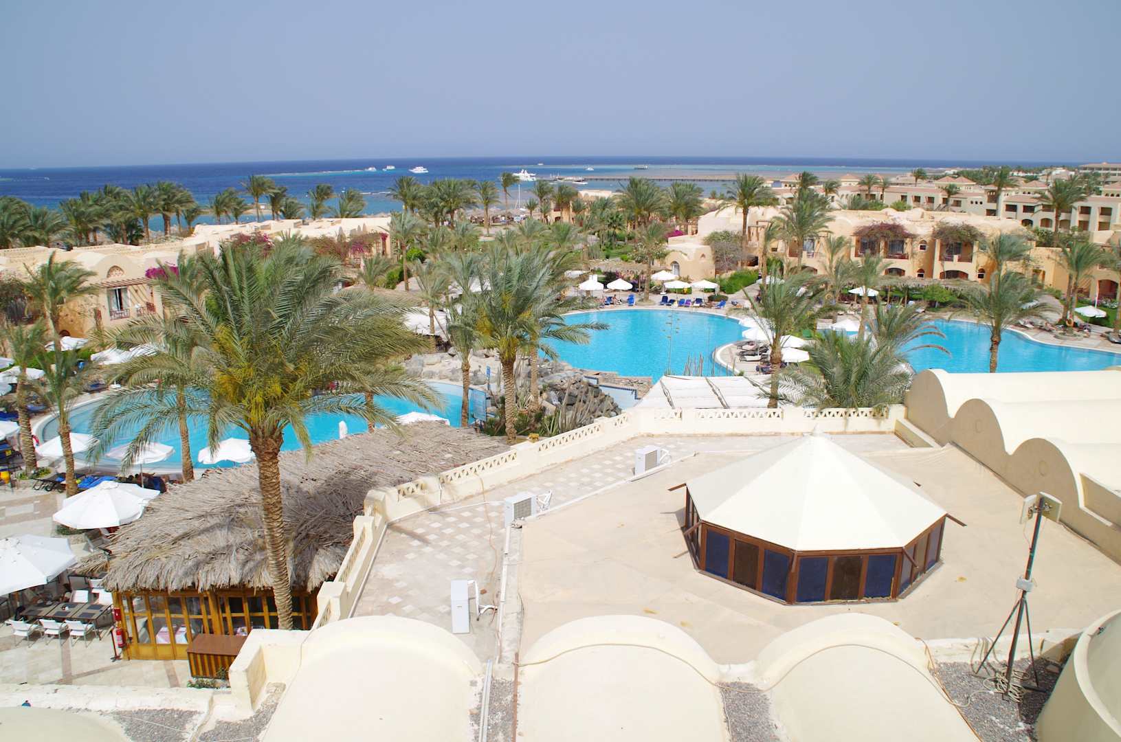Blick vom Turm auf die Poolanlage und dem angrenzenden Strand