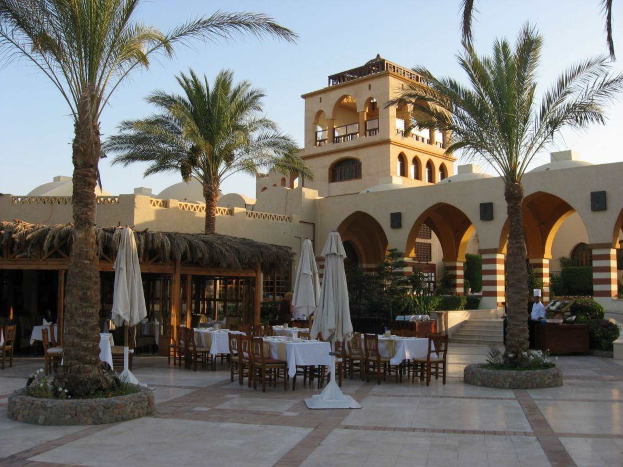 Blick auf das Buffetrestaurant und den Turm