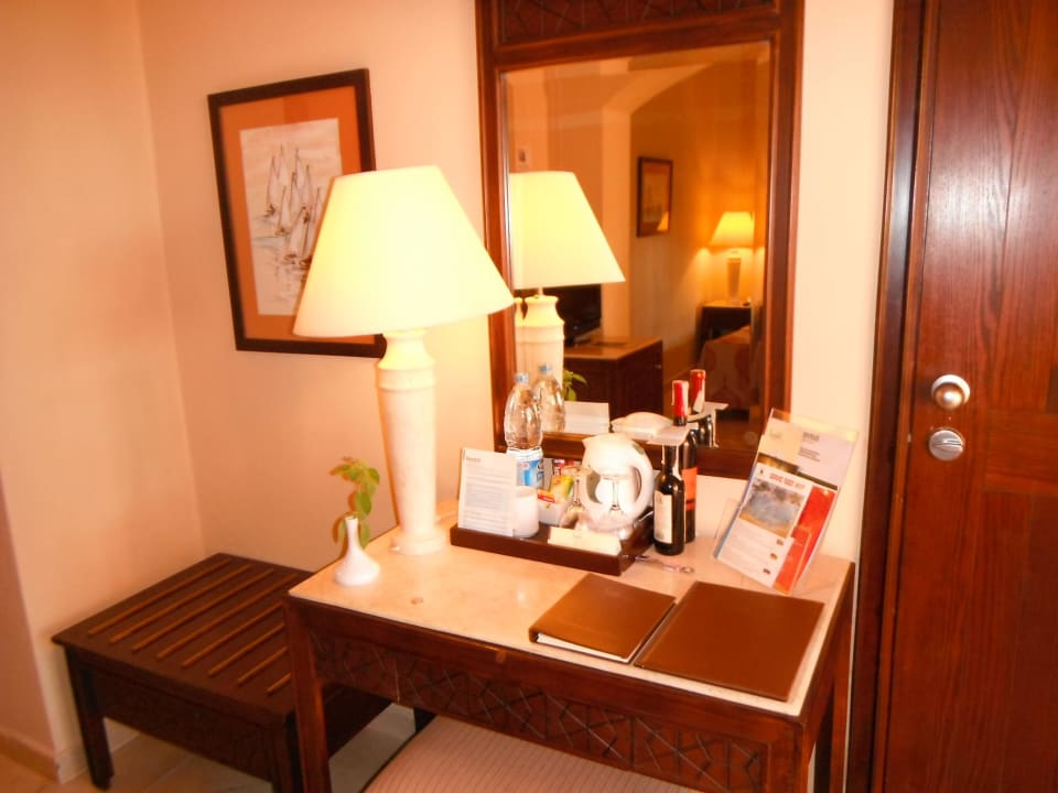 Tisch mit LampeMit Wasserkocher, immer eine frische Trinkwasserflasche. Kaffe und Tee. Tassen und Zucker vorhanden.
