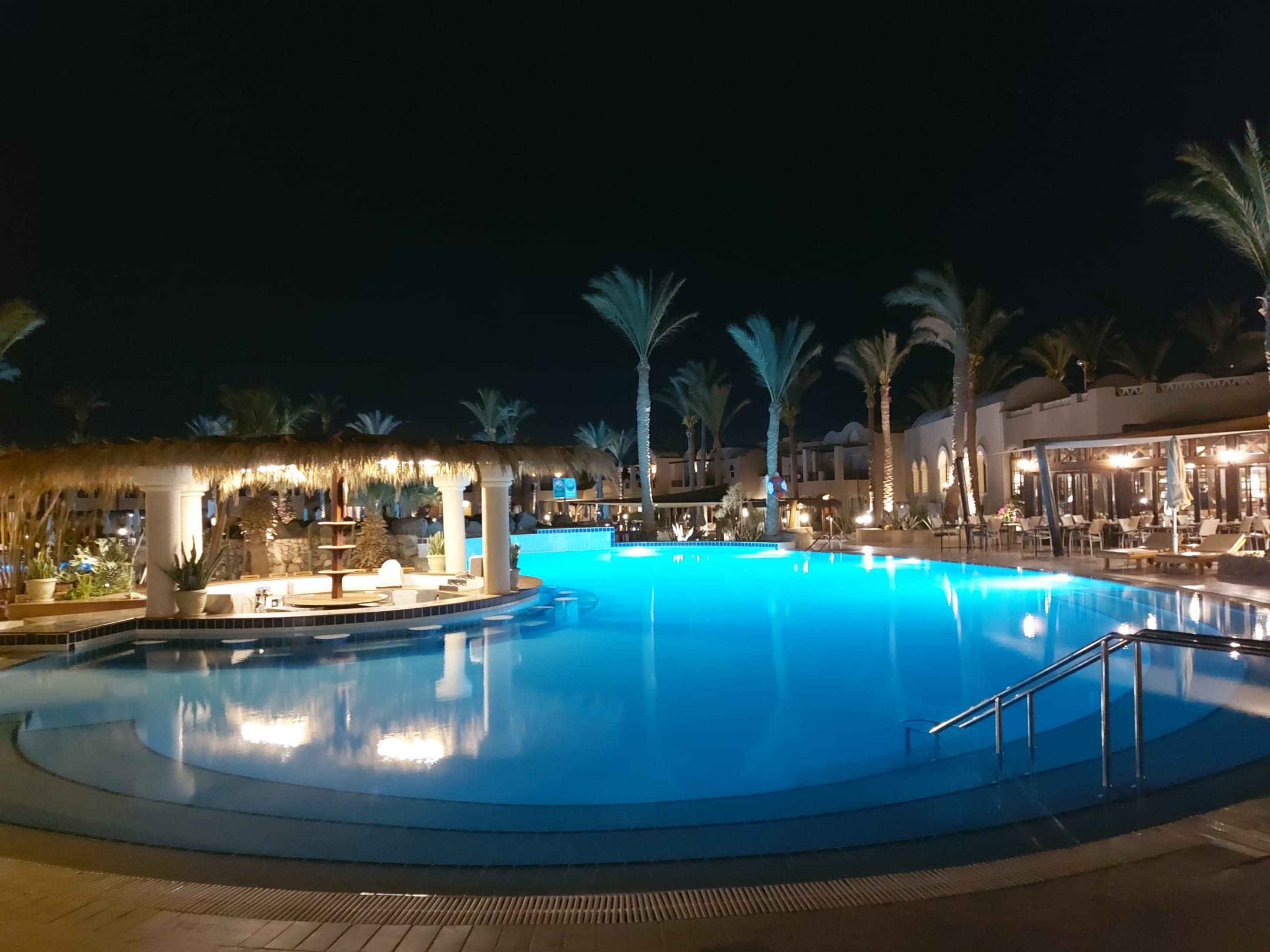 Beheizter Pool mit Poolbar am Abend