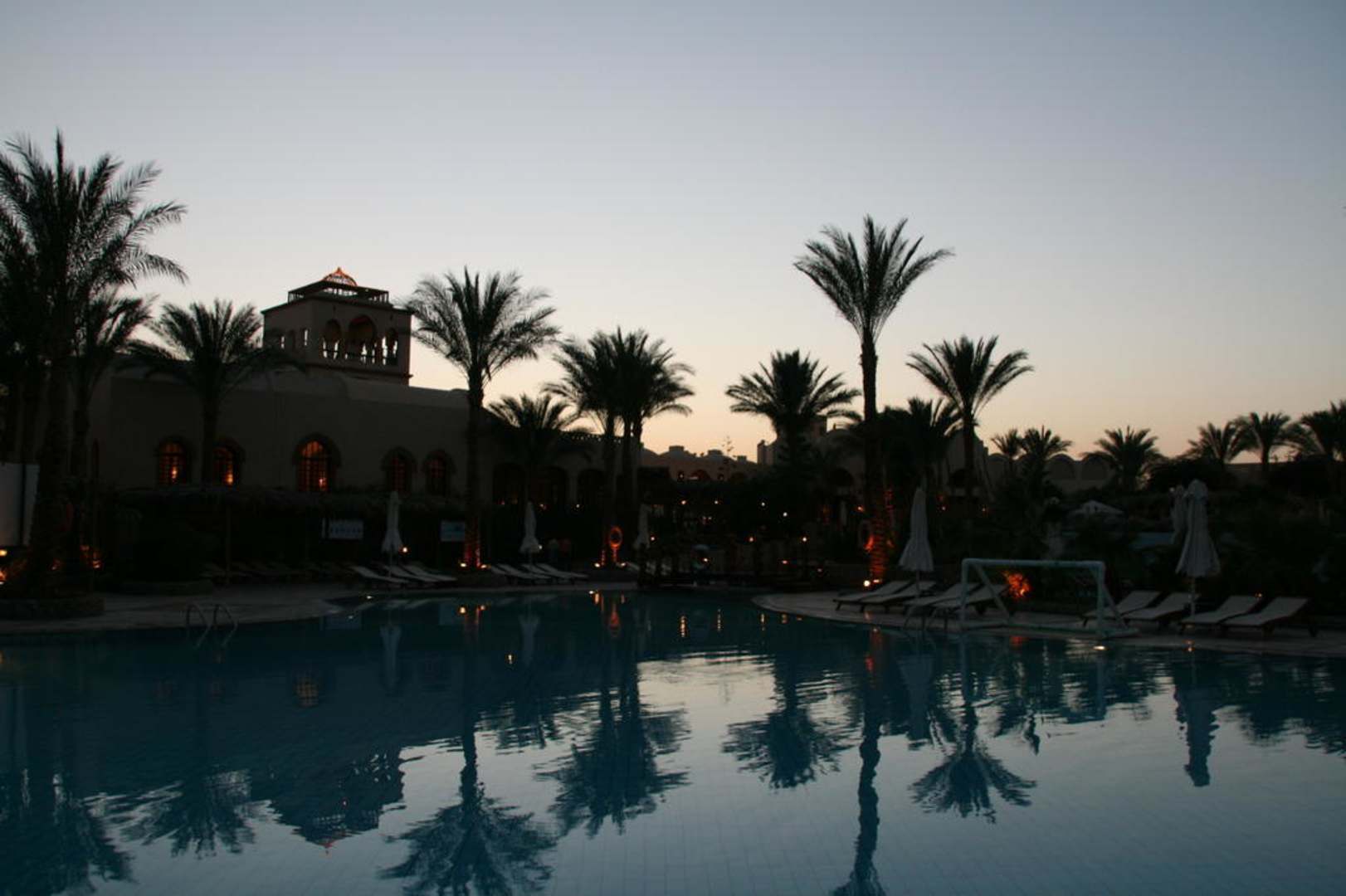 Poolanlage bei Sonnenuntergang
