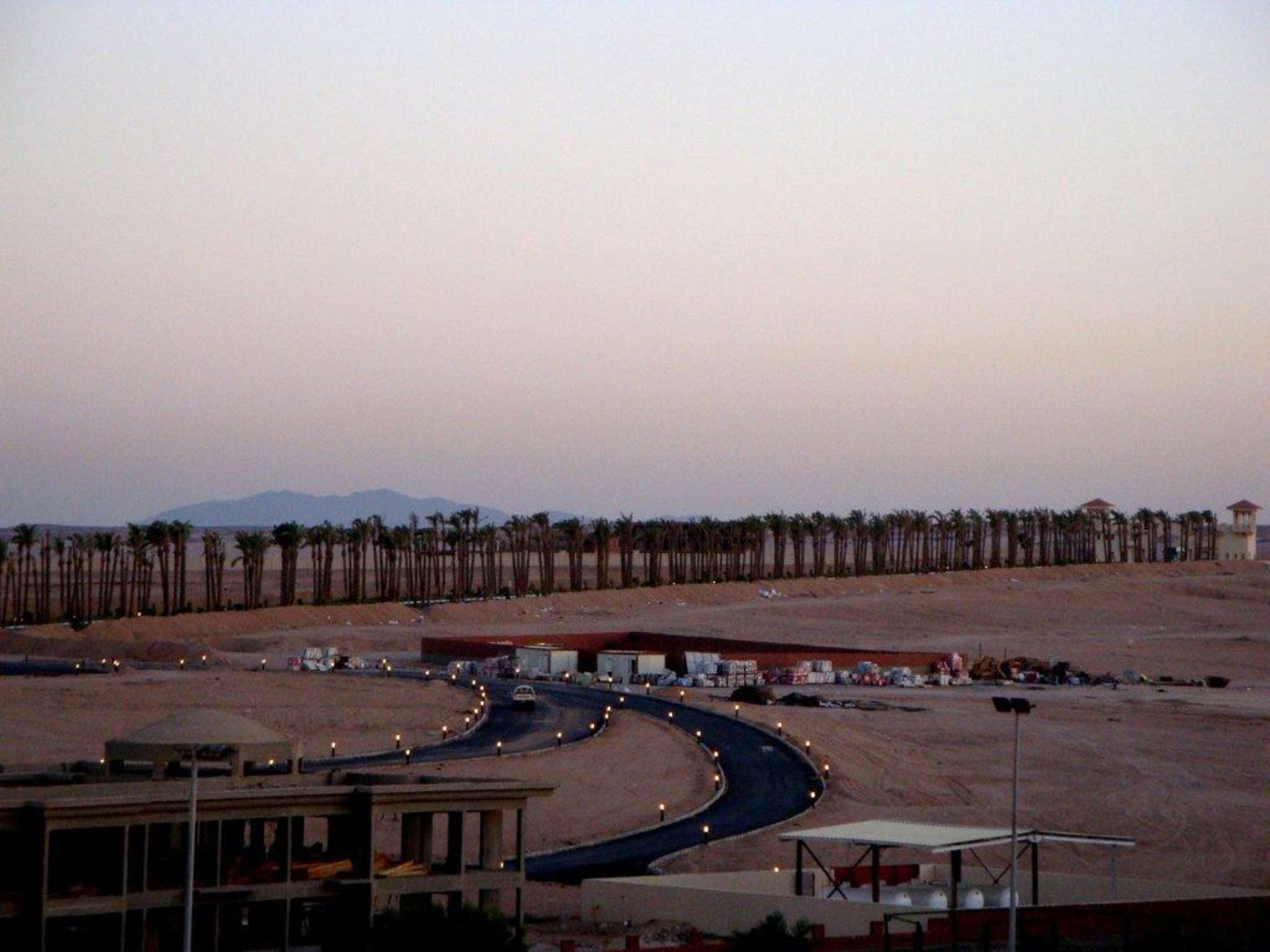 DIe Strasse zum Madinat Makadi. Ganz rechts kann man schwach die Eingangstore bzw. Beachwungstürme erkennen. Fotografiert vom Turm des Hotels.