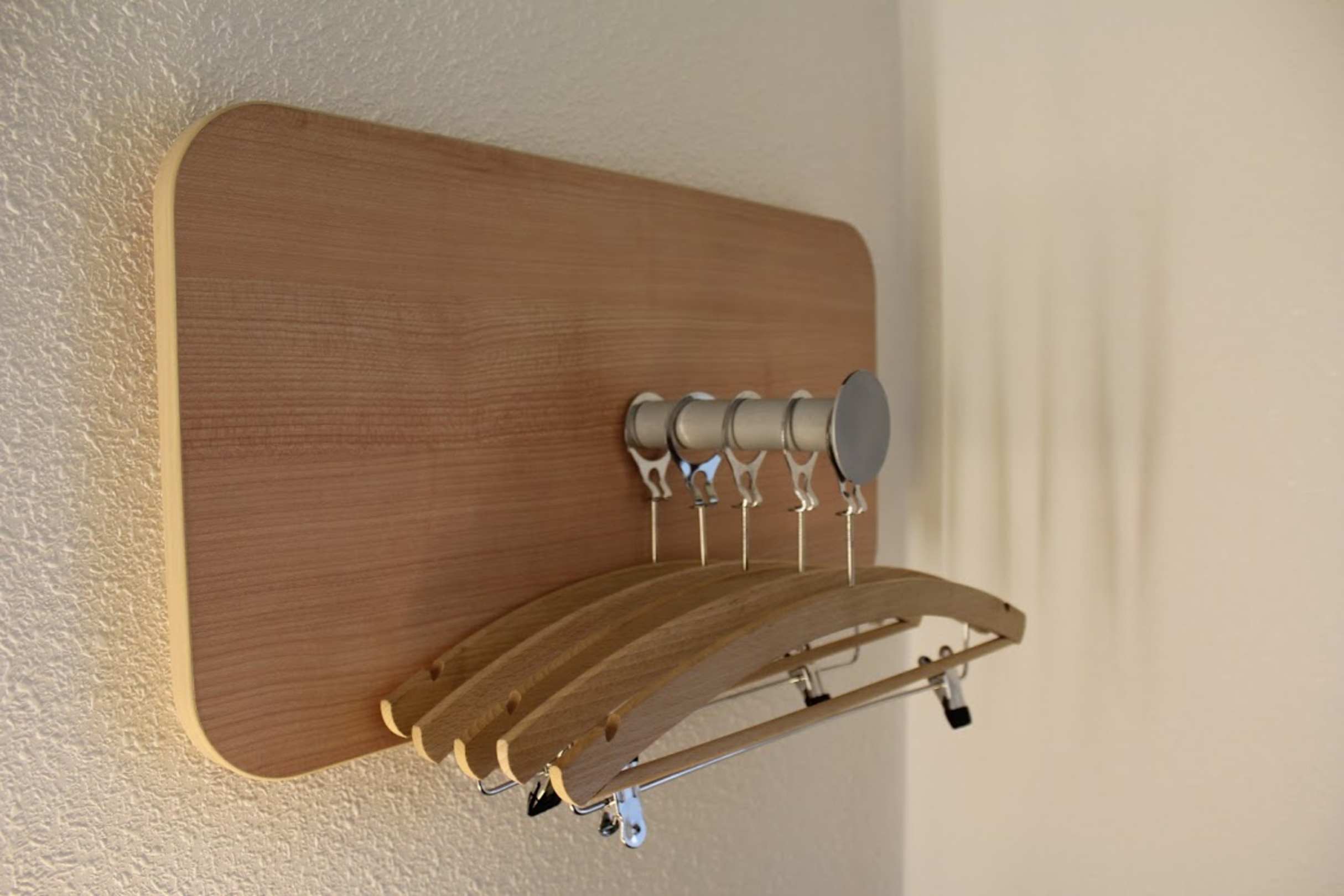 Kein Schrank im Zimmer. Nur ein Haken mit Kleiderbügeln.
