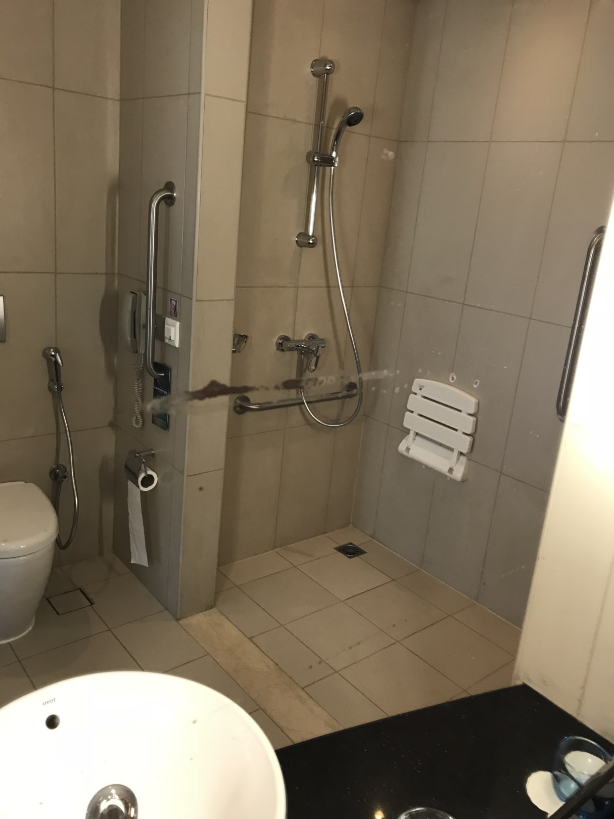Im Spiegel Dreck. Kein Duschvorhang, sodass alles nass wurde.