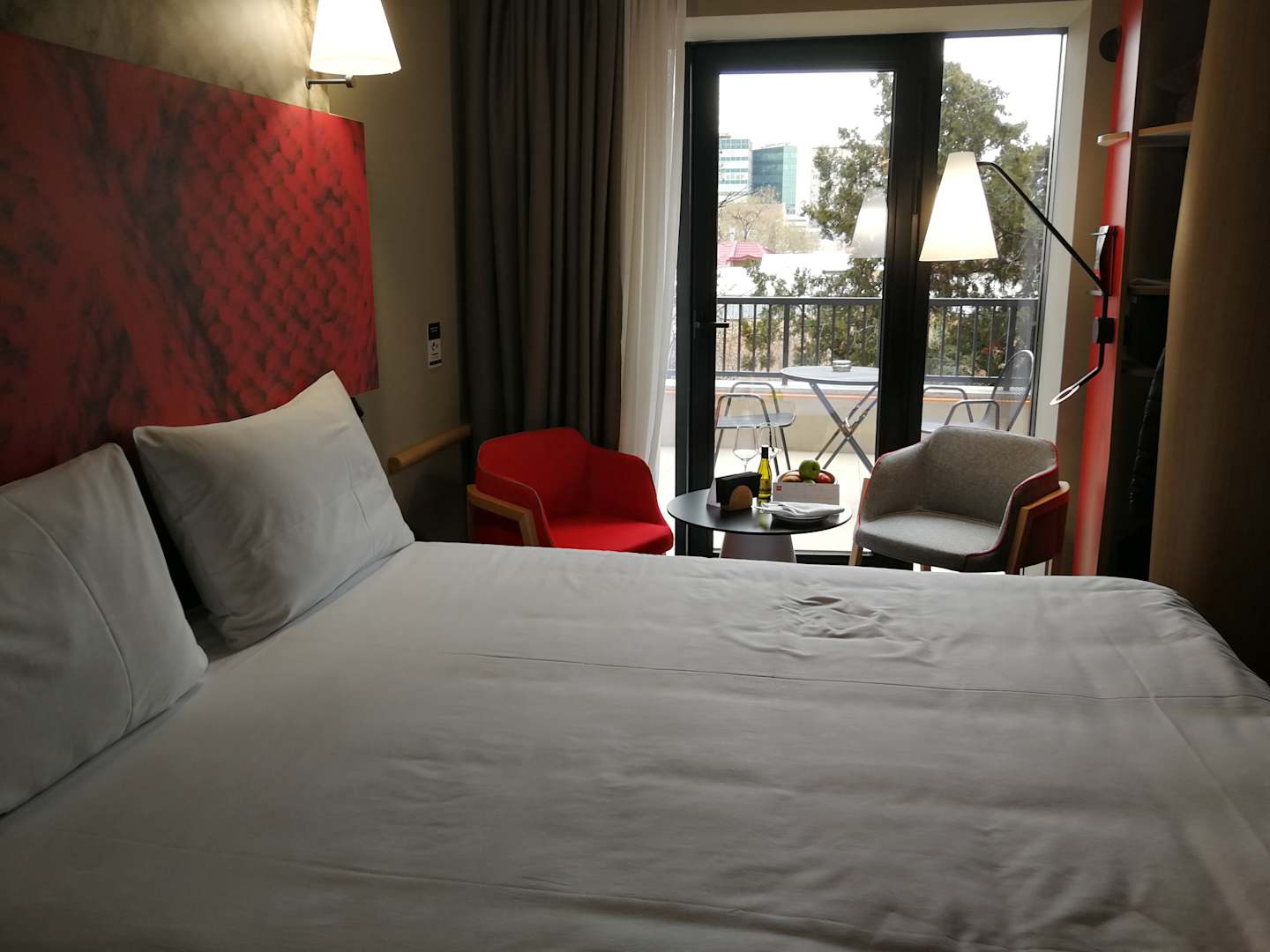Zimmer 215 - Bett und Sicht auf den Balkon