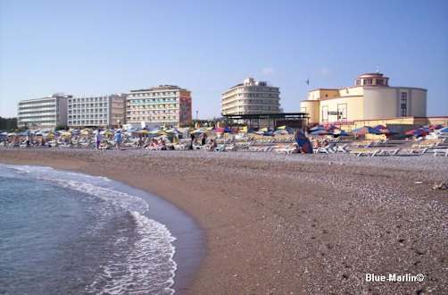 Ellibeach - Oststrand von Norden aus fotografiert. Die Hotels von links nach rechts: Mediteranean, Ibiscus, ???, Cactus und das sog. Aquarium