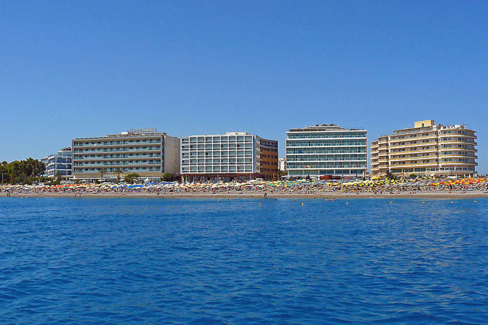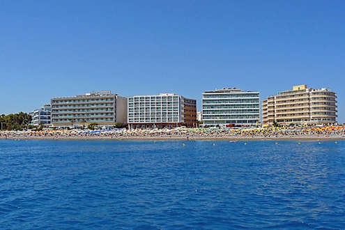 Aussicht auf Hotel Ibiscus und andere Hotels am Elli-Strand.