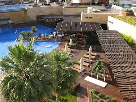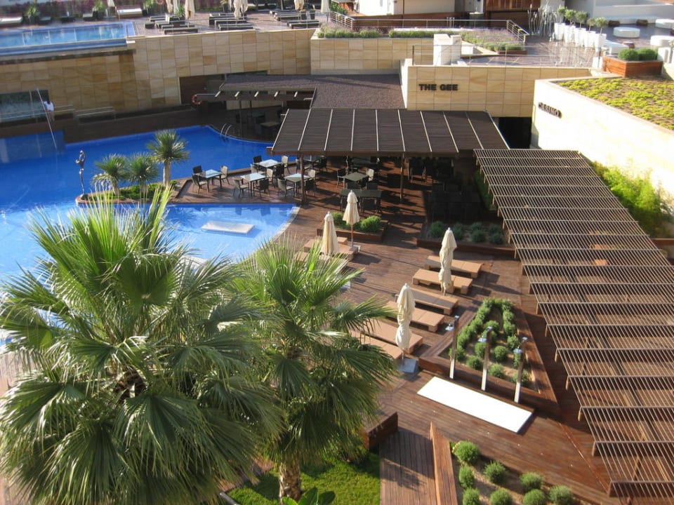 Blick auf die Poolanlage von der Terrasse des Zimmers