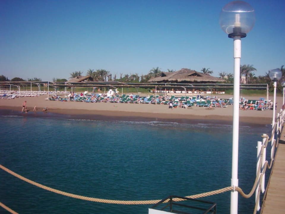Blick vom Steg auf den Strand des Hotels