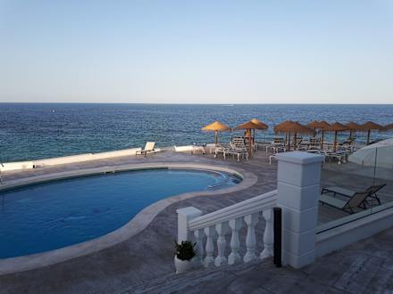 PoolBlick von der Terrasse beim Abendessen