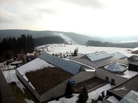 Blick zum SkiliftBlick aus der 8. Etage zum Skilift - im Vordergrund sieht man die Tennishalle und rechts daneben die Schwimmhalle