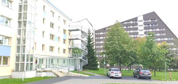 Rechts das angepriesene Hotel, links der Plattenbau in dem wir untergebracht wurden.