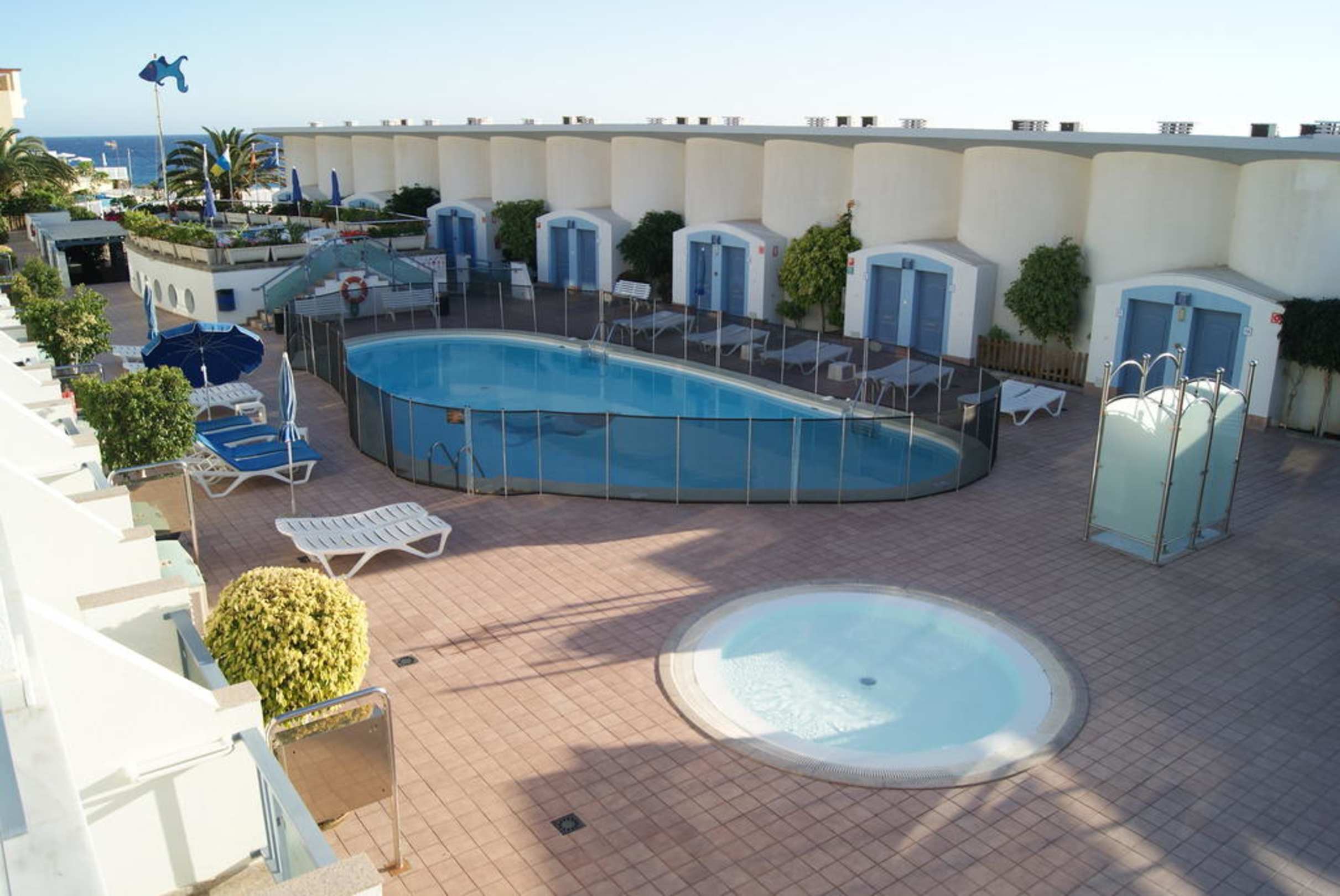 Links sind Appartment (nicht alle mit Meerblick), der Eingang ist der Terrassenbereich. Links die blauen Türen sind der Eingang zu den Appartements die direkten Blick zum Meer haben.