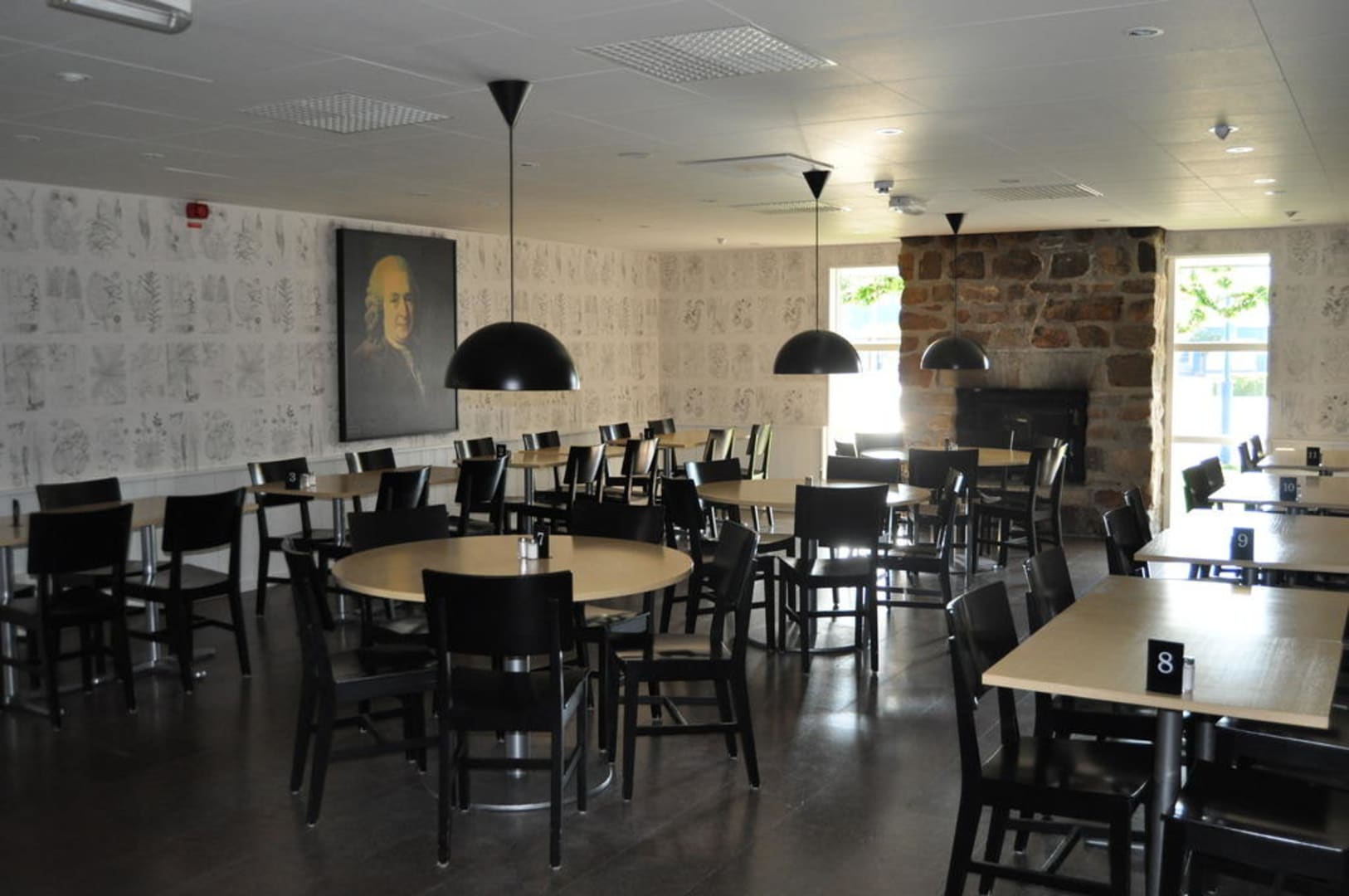 Eine der Sitzmöglichkeiten im Restaurantbereich. Gestaltet mit Tapeten im Stil von Carl von Linné, d.h. mit Pflanzenmotiven. Im Hintergrund links das Bild des Botanikers Carl von Linné.