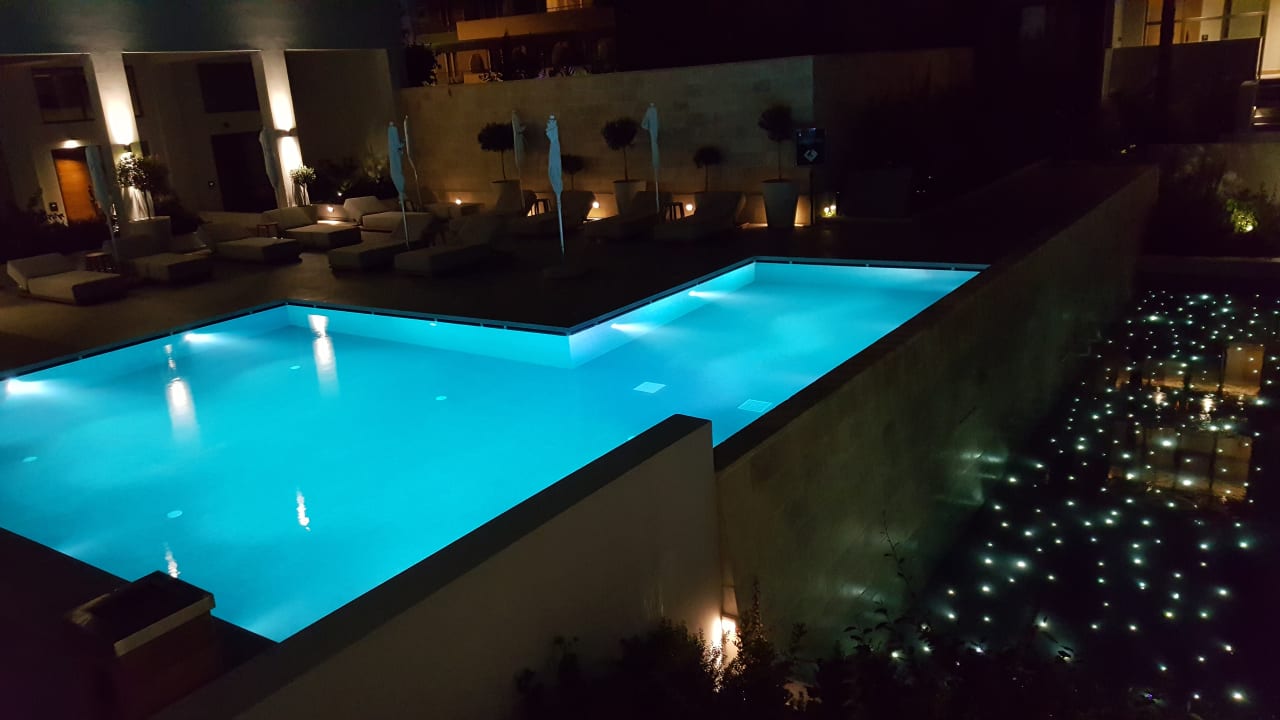 Innenbereich Hotel mit Pool am Abend