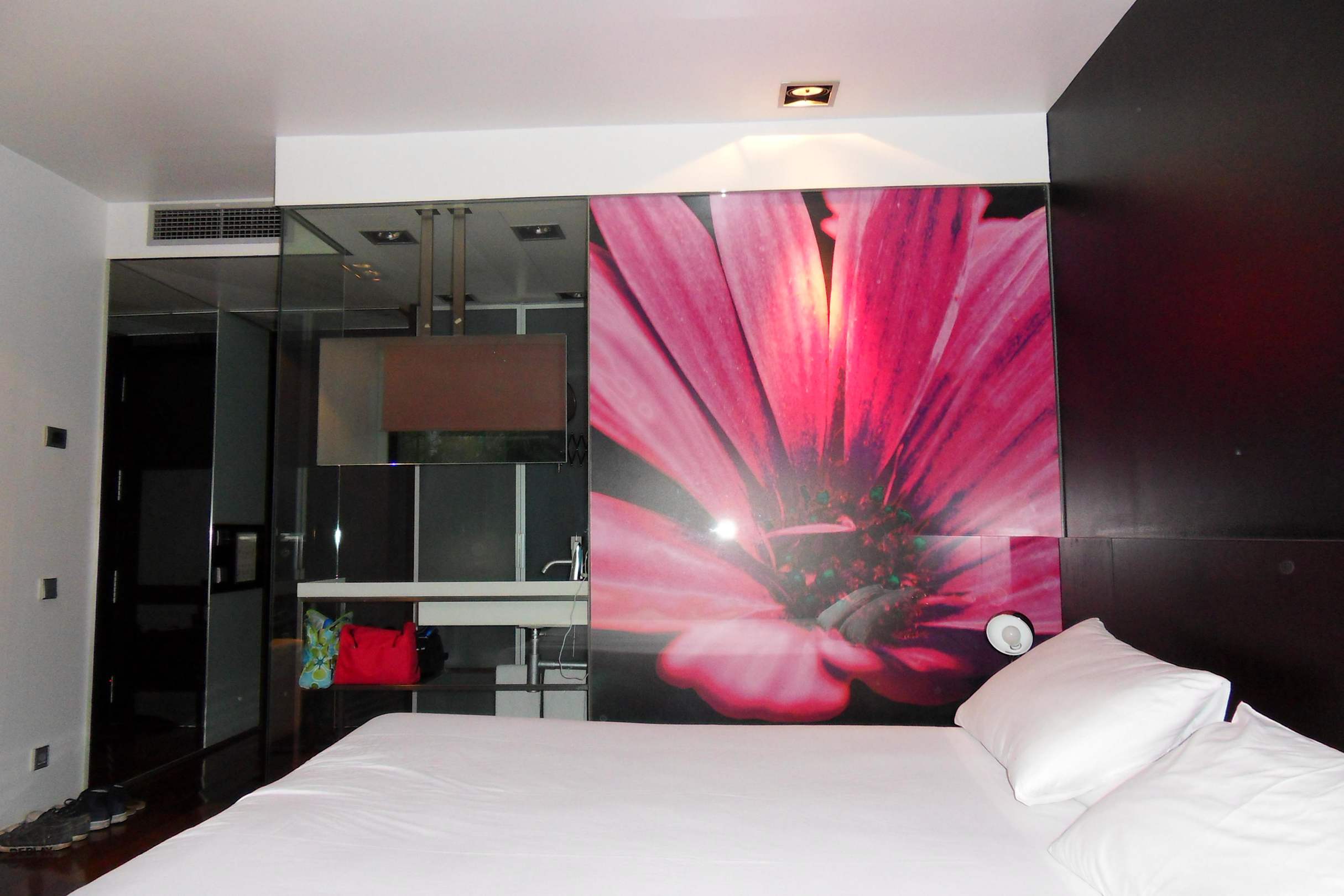 Zimmer nach der Reinigung mit Blick vom Fenster zum Bad. Waschbecken mit Spiegel ist links hinter der Glaswand. Rechts hinter der Blume ist WC+Dusche.