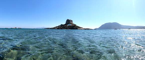 Ausblick vom Strand auf die vorgelagerte kleine Insel mit der "Agios Stefanos"