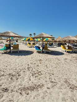 Der Strand liegt etwa 800m entfernt. Es fährt von Montags bis Freitag ein kleiner Shuttelbus vom Hotel aus. Der Strand is im Mai noch nicht überlaufen. Einer der schönsten Sandstrände(Tigaki)