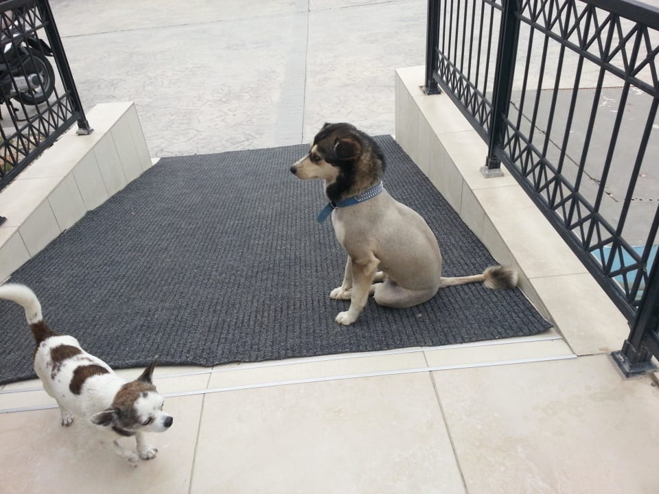 Hotel-Löwin Hasgaki mit Urlauber ChiwiDer Husky-Hündin wurde wegen der Hitze im Sommer ein Sommerhaarschnitt verpasst.
