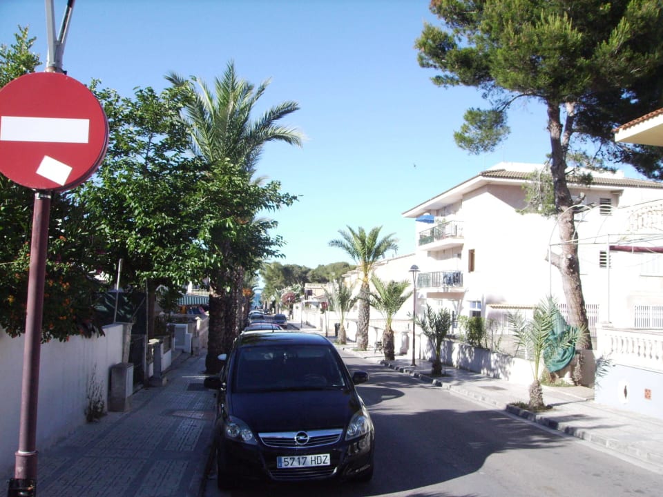 Vor dem Hotel stehend die Straße zum Strand