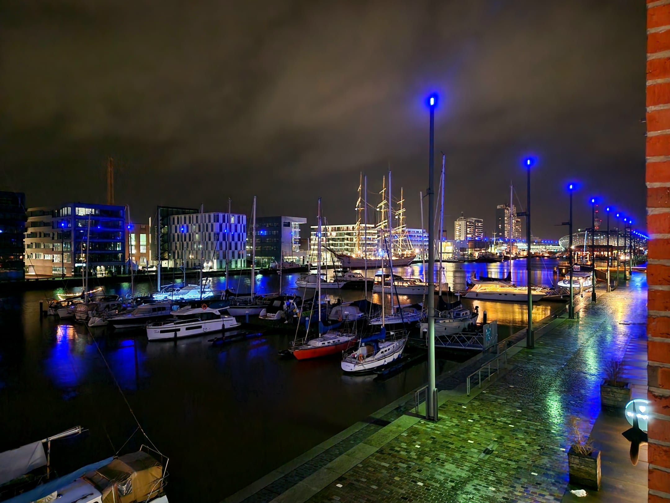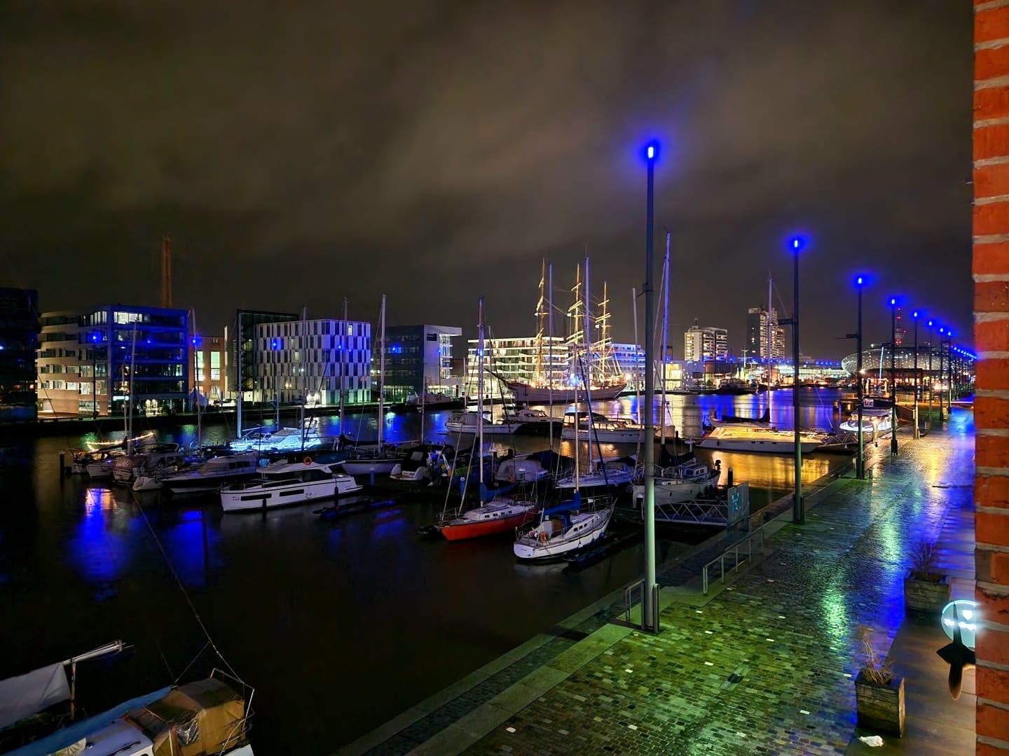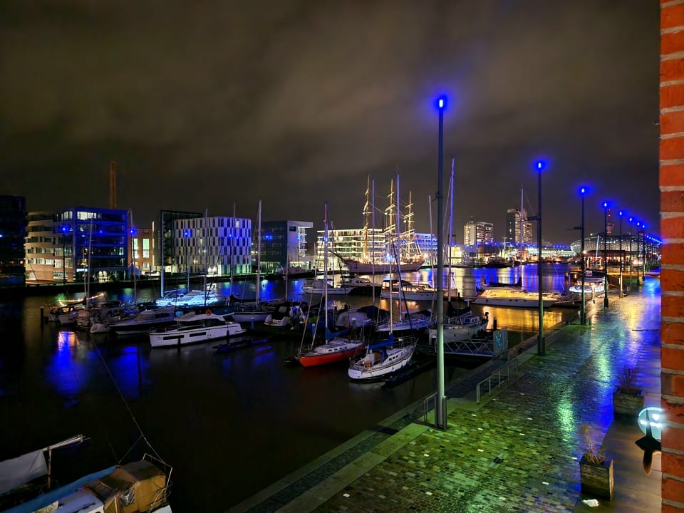 Neuer Hafen bei Nacht mit beleuchtetem Segelschulschiff Deutschland im Hintergrund