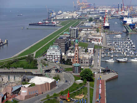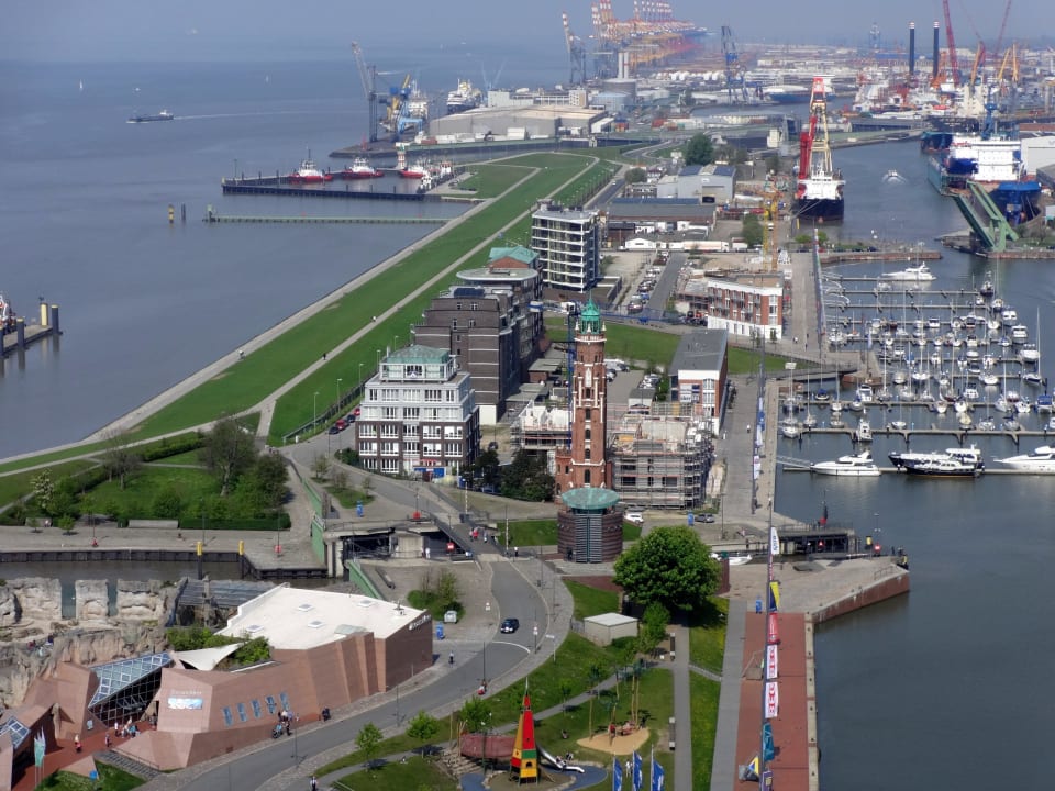 Blick von der Aussichtsplattform des "Atlantik Hotel Sail City" - das "Im Jaich Hotel" in der Mitte des Bildes am Yachthafen - eine erstklassige Lage!!