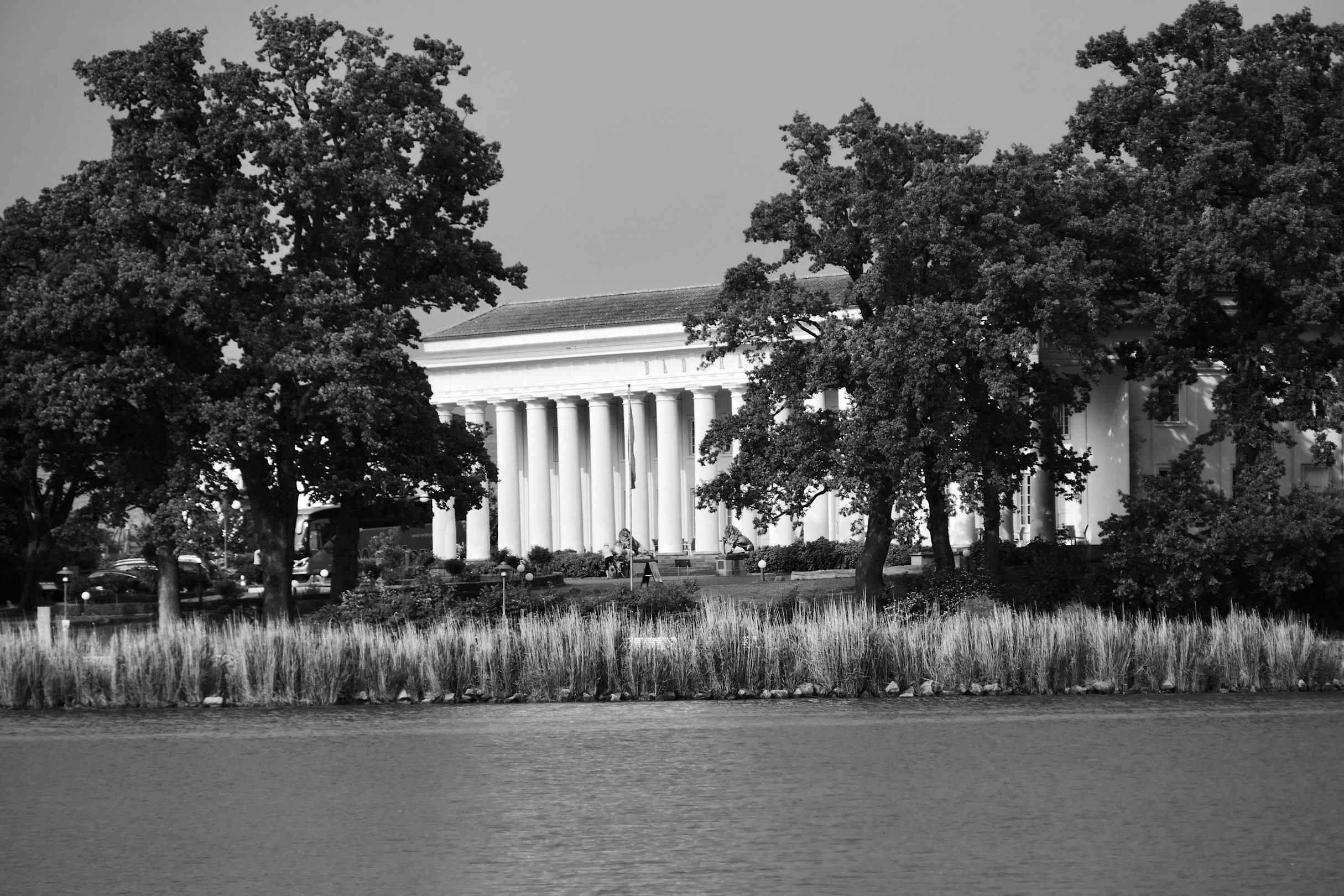 Blick vom schwimmenden Ferienhaus zum Badehaus Goor