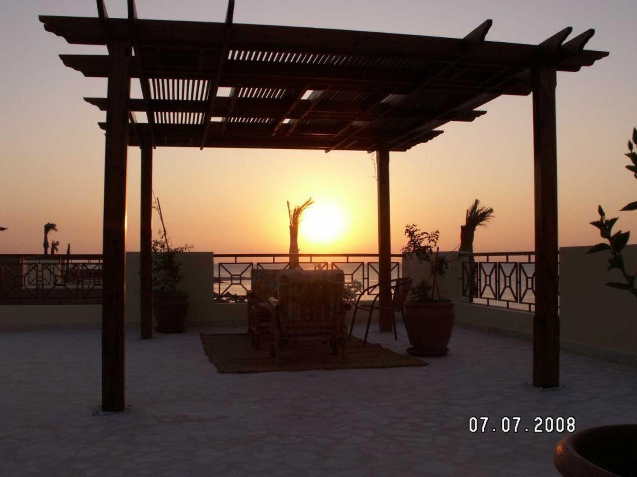 Zachód słońca na tarasie przyległym do pokoju hotelowego.
