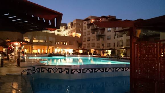 Poolanlage vom Strand aus