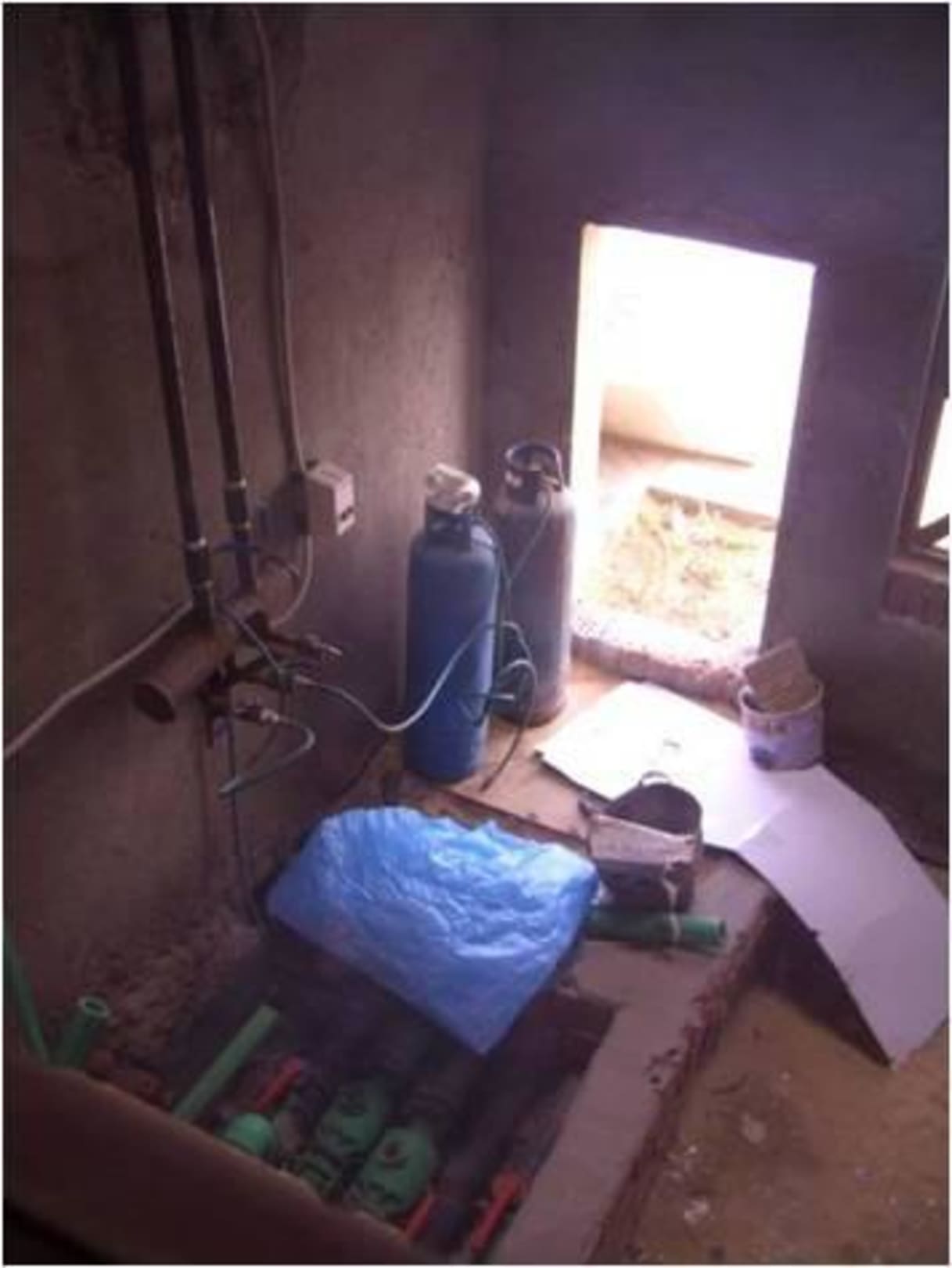 Bauschutt und Gas-Sauerstoffflasche.