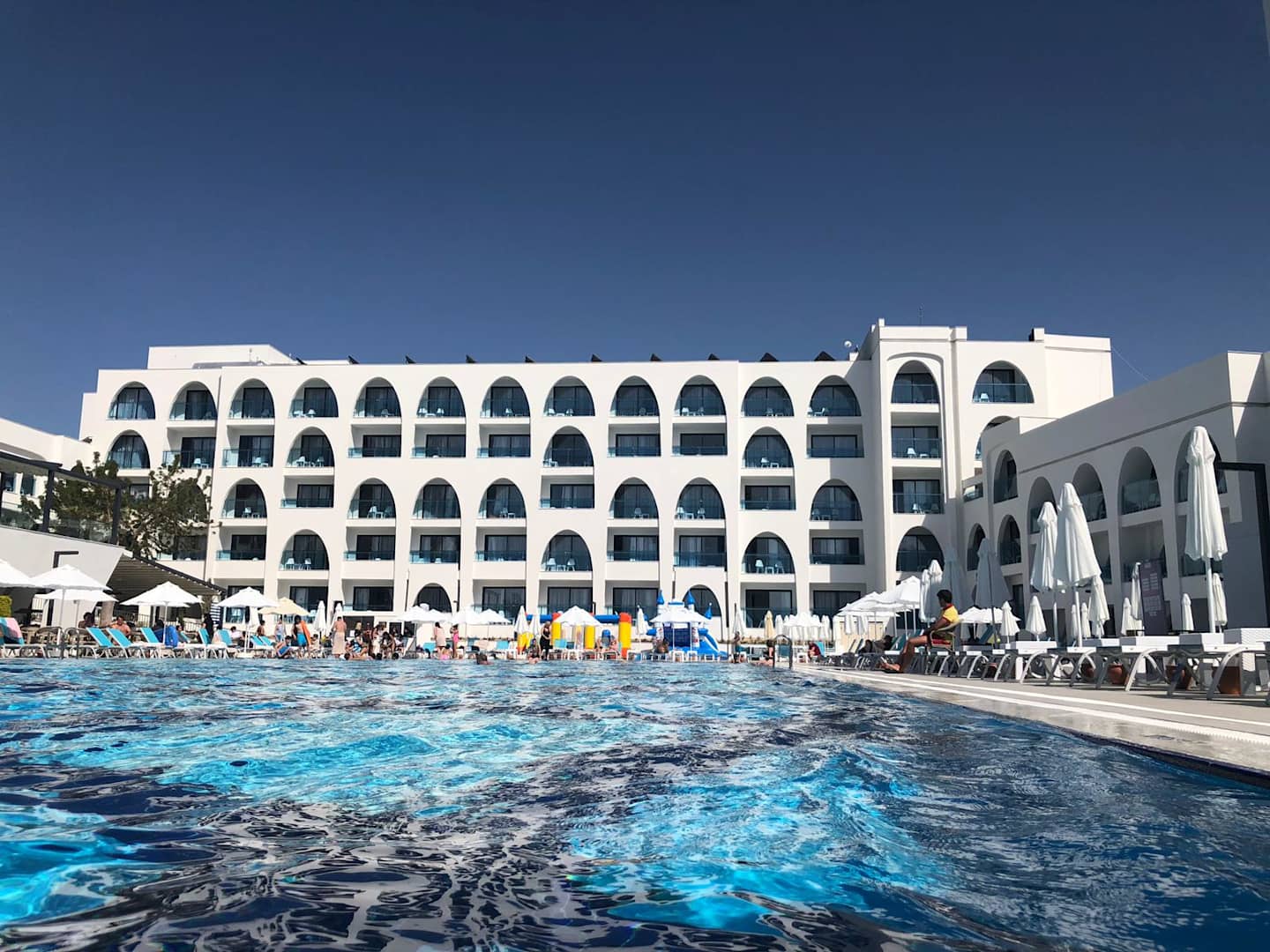 Part of the hotel and pool, viewed from the seaside