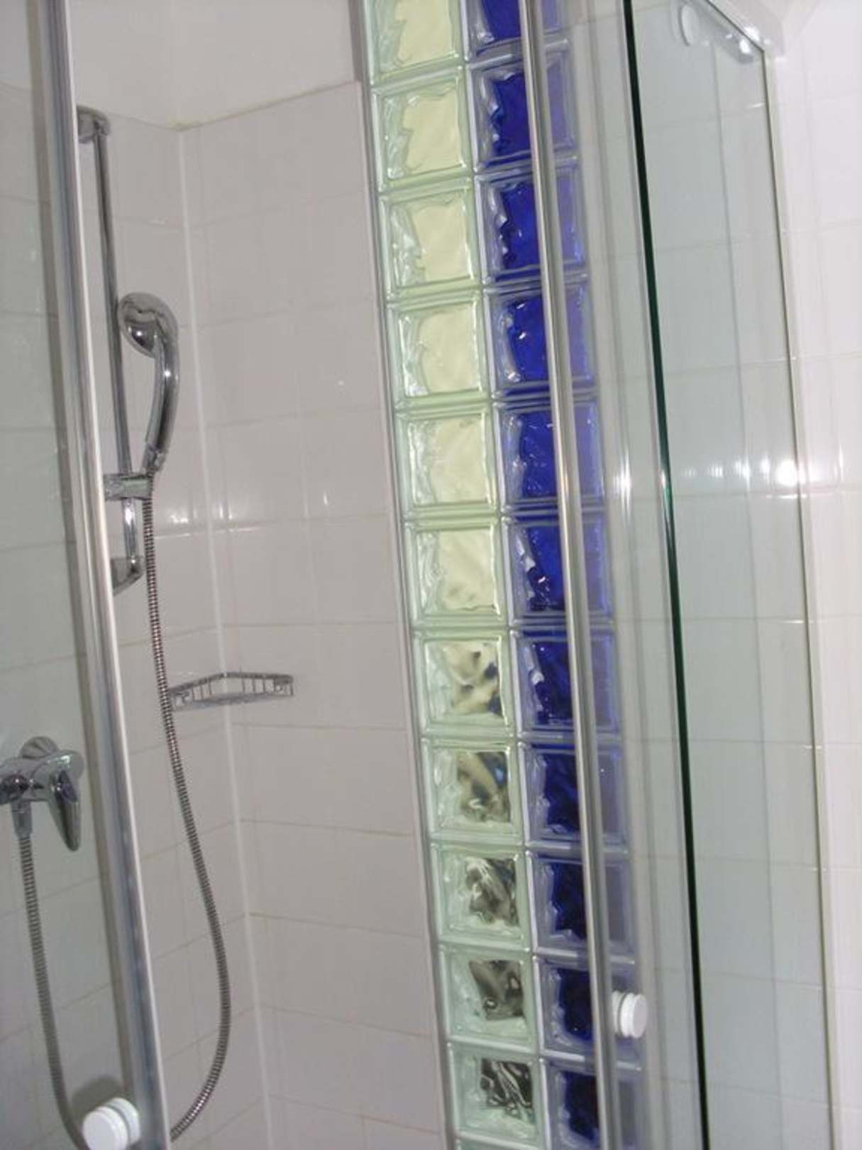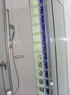 Die Dusche mit Blick ins Zimmer.